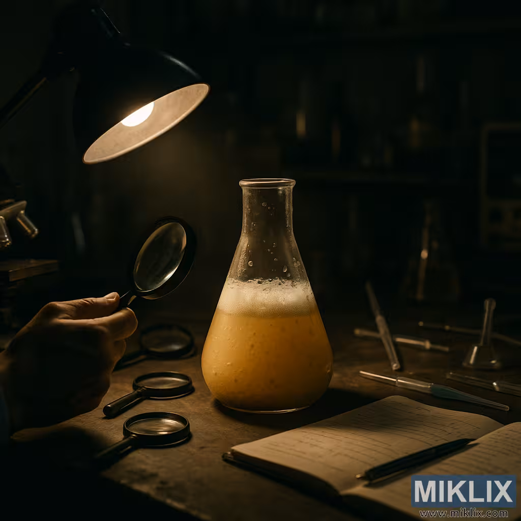 यो तस्बिरले शान्त एकाग्रता र वैज्ञानिक अनुसन्धानको वातावरणले भरिएको मधुरो प्रकाश भएको प्रयोगशाला कार्यस्थल चित्रण गर्दछ। रचनाको केन्द्रमा बादल लागेको, फिक्का-पहेंलो, खमीरयुक्त तरल पदार्थ भएको ठूलो गिलासको फ्लास्क छ। तरल पदार्थ निलम्बित कणहरूले बनेको हुन्छ, जसले किण्वन वा सूक्ष्मजीव गतिविधिलाई संकेत गर्छ, र यसको गोलाकार आधारले नजिकैको डेस्क बत्तीको न्यानो चमक समात्छ। फ्लास्कको ठीक माथि राखिएको बत्तीले प्रकाशको केन्द्रित वृत्त बनाउँछ जसले भाँडोलाई उज्यालो पार्छ र अव्यवस्थित कार्यक्षेत्रमा नरम, लामो छायाँ सिर्जना गर्दछ।