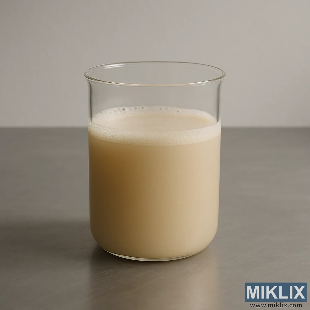 तस्बिरले सरसफाइ, शुद्धता र प्राविधिक स्पष्टतालाई जोड दिने सरल तर उत्तेजक प्रयोगशाला दृश्य प्रस्तुत गर्दछ। तस्बिरको केन्द्रमा ब्रश गरिएको स्टेनलेस स्टील काउन्टरटपमा वर्गाकार रूपमा आराम गरिरहेको पारदर्शी बेलनाकार बोरोसिलिकेट गिलास बीकर बसेको छ। बीकर लगभग काँधसम्म धुंधला, बेज रंगको तरल पदार्थले भरिएको छ, थोरै अपारदर्शी तर स्वरमा एकरूप, जसले भित्र खमीर वा अन्य सूक्ष्म कणहरूको निलम्बनलाई सुझाव दिन्छ। तरल पदार्थको सतह माथि जम्मा हुने साना, नाजुक बुलबुलेहरूबाट बनेको फोमको पातलो तर देखिने तहले ढाकिएको छ। यो सूक्ष्म फोम तहले किण्वन जस्ता सक्रिय जैविक प्रक्रियालाई संकेत गर्दछ, जबकि एकै साथ अन्यथा क्लिनिकल सेटिङ भित्र हुने जीवन र रूपान्तरणको भावनालाई बलियो बनाउँछ।