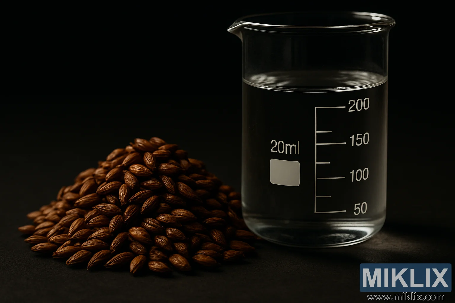 गिलासको बीकरमा एम्बर माल्टको दाना र पकाउने पानीको स्थिर जीवन म्याक्रो, न्यानो प्रकाश र छायाँले बनावट र पकाउने रसायनलाई हाइलाइट गर्दछ।