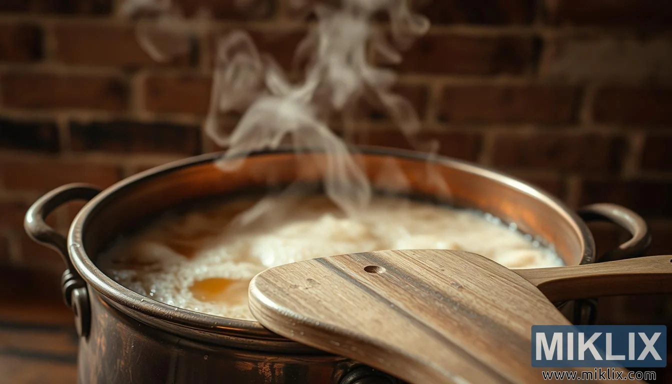 यो तस्बिरले कारीगरीको कामको आत्मालाई बोल्छ। यो केवल सामग्री वा उपकरणको बारेमा होइन - यो वातावरण, मनसाय र सावधानीपूर्वक केहि सिर्जना गर्ने शान्त सन्तुष्टिको बारेमा हो। भाँडोमा विकासशील बियर वर्ट, पौष्टिक सुप, वा मसलादार इन्फ्युजन होस्, दृश्यले दर्शकलाई बाफसँगै उठ्ने सुगन्धको कल्पना गर्न आमन्त्रित गर्दछ: टोस्ट गरिएको अन्न, कारमेलाइज्ड चिनी, माटोको जडीबुटी। यो बनावट र भावनाले भरिपूर्ण दृश्य रूपमा प्रस्तुत गरिएको संवेदी अनुभव हो।