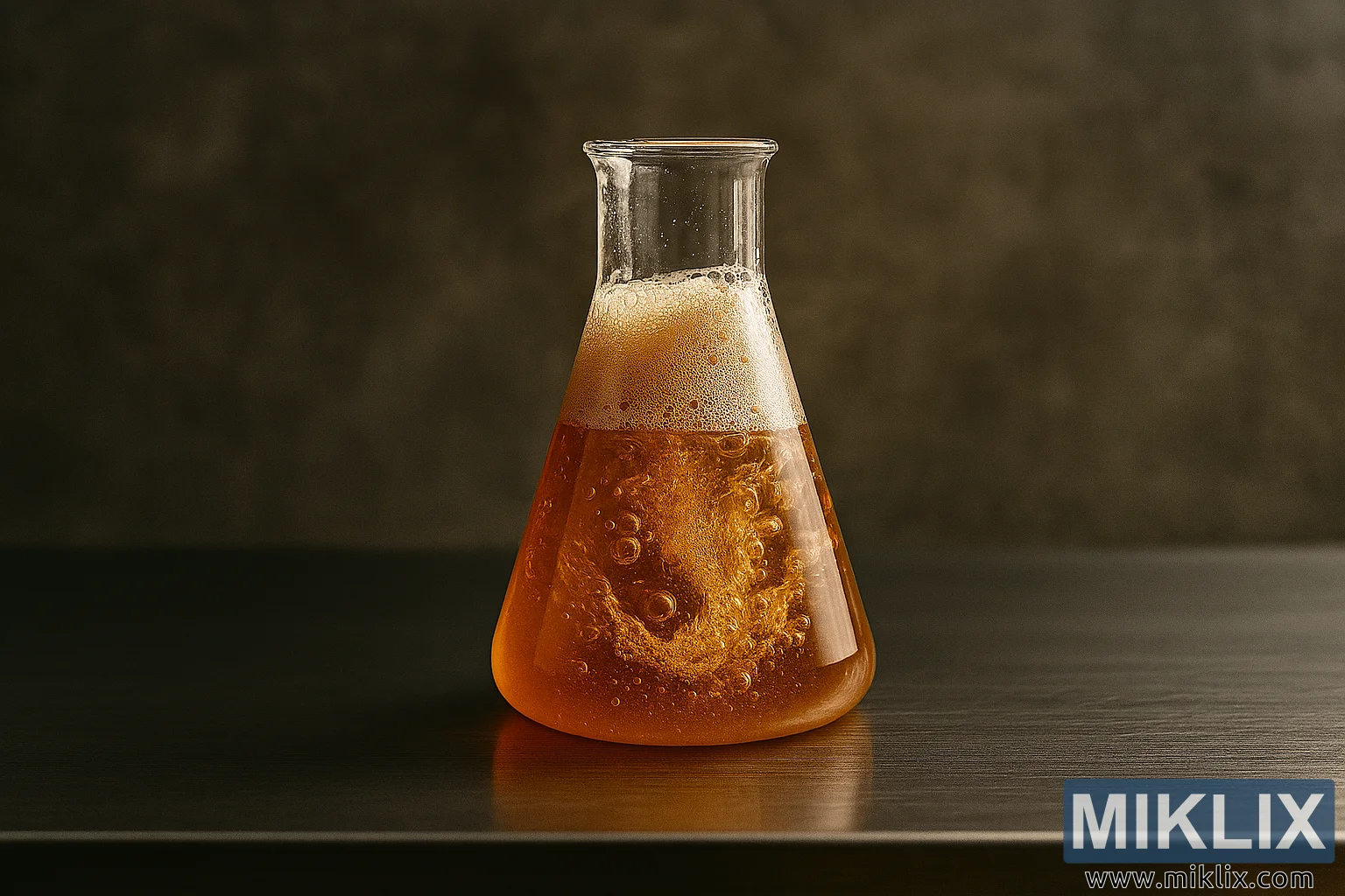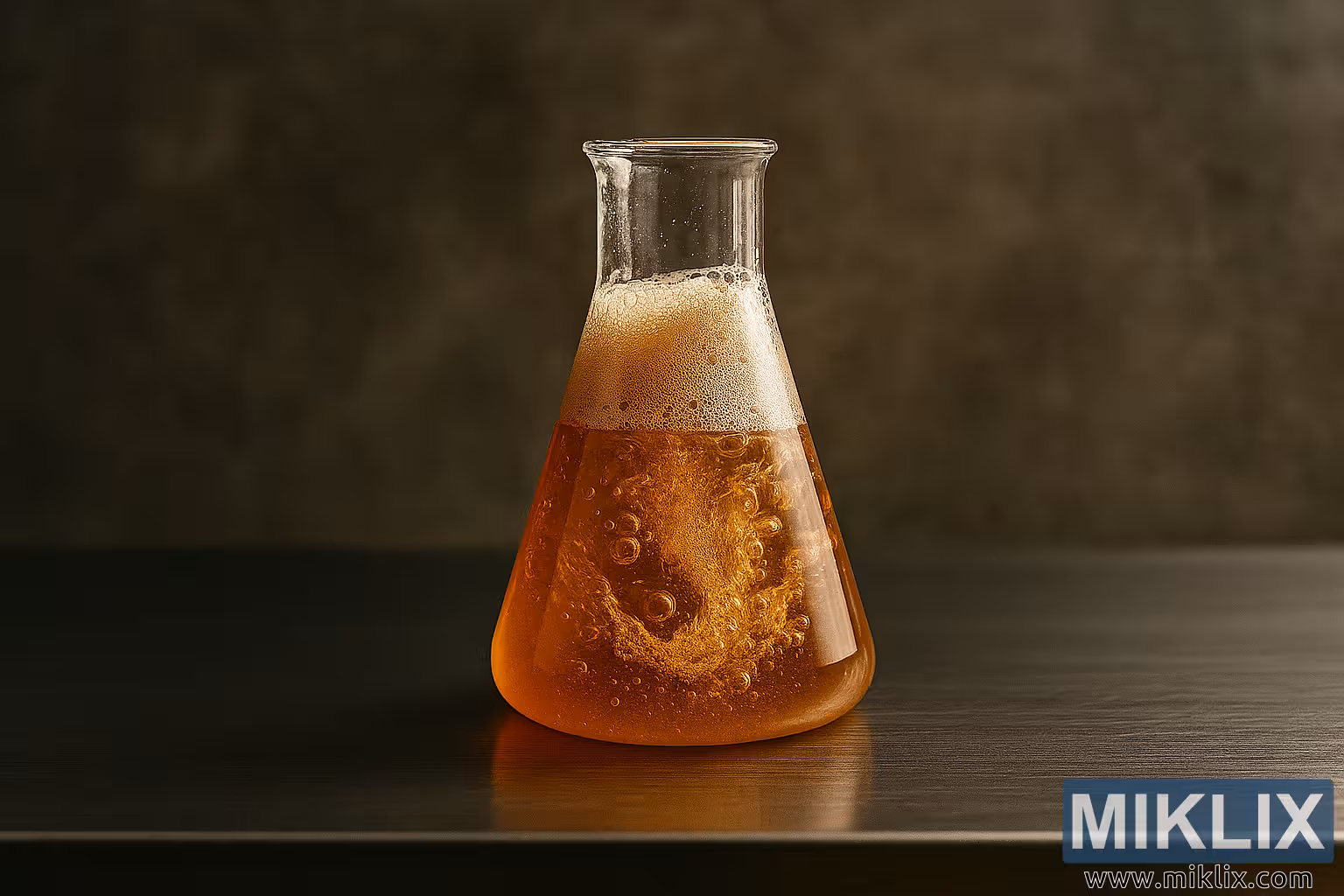 Een wervelende, schuimende amberkleurige vloeistof in een glazen beker op een roestvrijstalen laboratoriumtafel, die de wetenschap en kunst van de amberkleurige lagerfermentatie vastlegt.