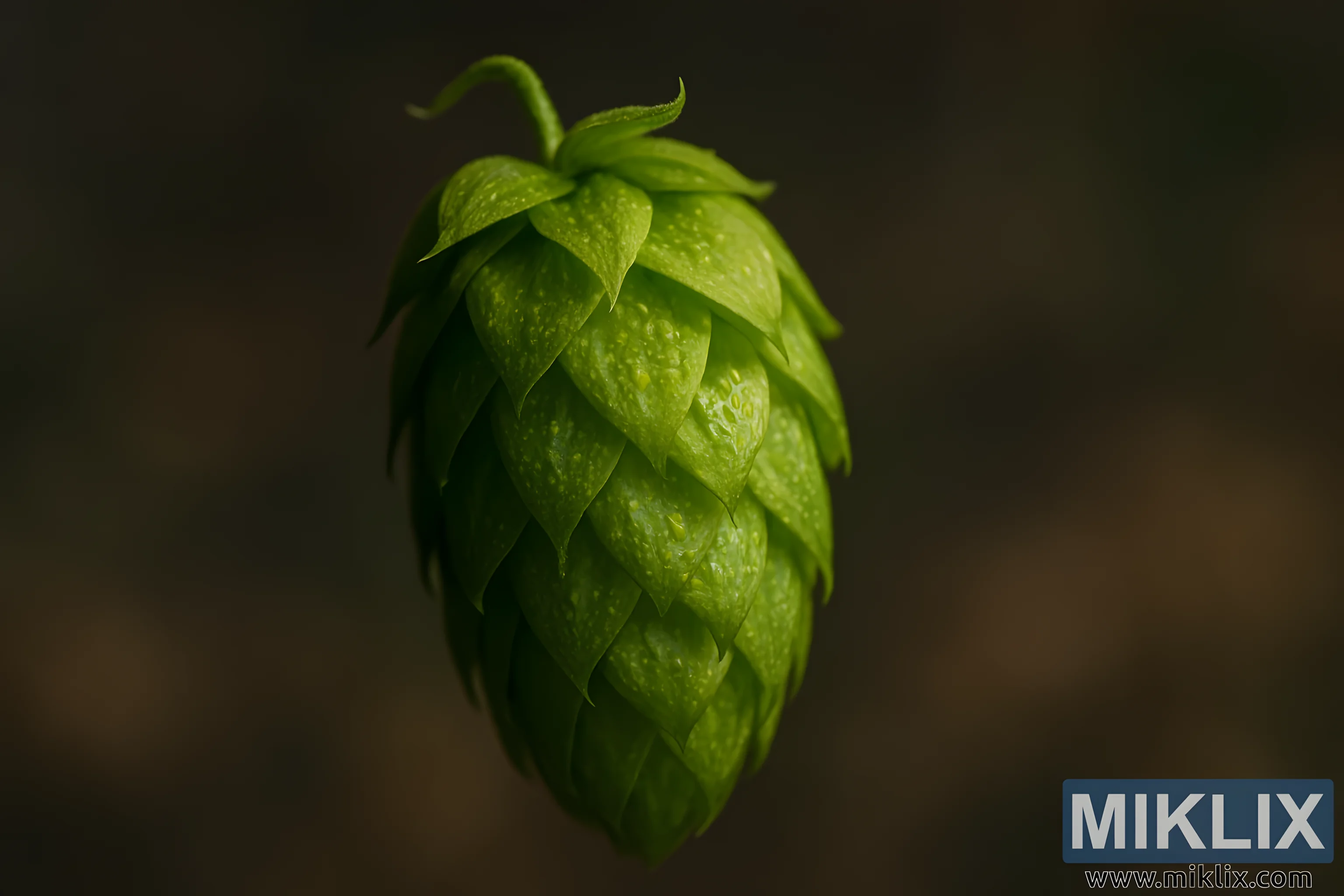 De achtergrond is weergegeven in een romige bokeh-waas, met kleuren als een gedempte mix van warme bruintinten en zacht olijfgroen die doen denken aan hout of aarde, maar abstract genoeg blijven om niet de aandacht te trekken. Deze onscherpe achtergrond biedt een sereen, neutraal canvas dat de levendigheid van de groene tinten van de hopbel versterkt zonder visuele rommel te creëren. De afwezigheid van concurrerende elementen zorgt ervoor dat de aandacht van de kijker uitsluitend op het onderwerp gericht blijft, waardoor de betekenis ervan binnen het kader wordt versterkt.