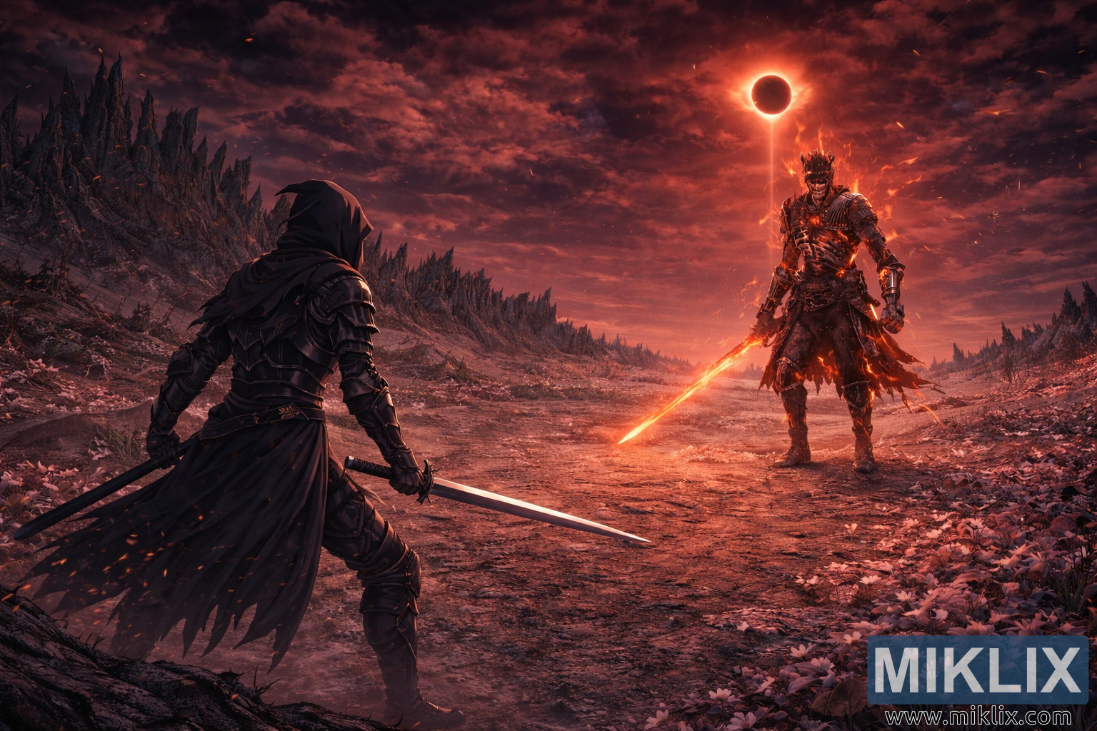 Tegenover het asgrauwe landschap staat een torenhoge, vurige ridder wiens harnas gebroken en doordrenkt met gesmolten energie lijkt. Scheuren in zijn borst, armen en benen gloeien als lavastromen onder afgekoelde vulkanische rotsen en werpen pulserende oranje en karmozijnrode lichtvlekken op de aarde. De ridder draagt een vlammend grootzwaard dat vonken en rondzwevende sintels uitstoot, het gloeiende lemmet verlicht de nabijgelegen bloemen en as met een levendige, vurige glans. Zijn houding is rechtop en imponerend, straalt kracht en zelfvertrouwen uit en vormt een visueel contrast met de waakzame paraatheid van de schimmige krijger. De afstand tussen hen wordt gevuld met kale grond, verspreide bleke bloesems en rondzwevende as, wat een spookachtig contrast vormt tussen fragiel leven en overweldigende verwoesting.