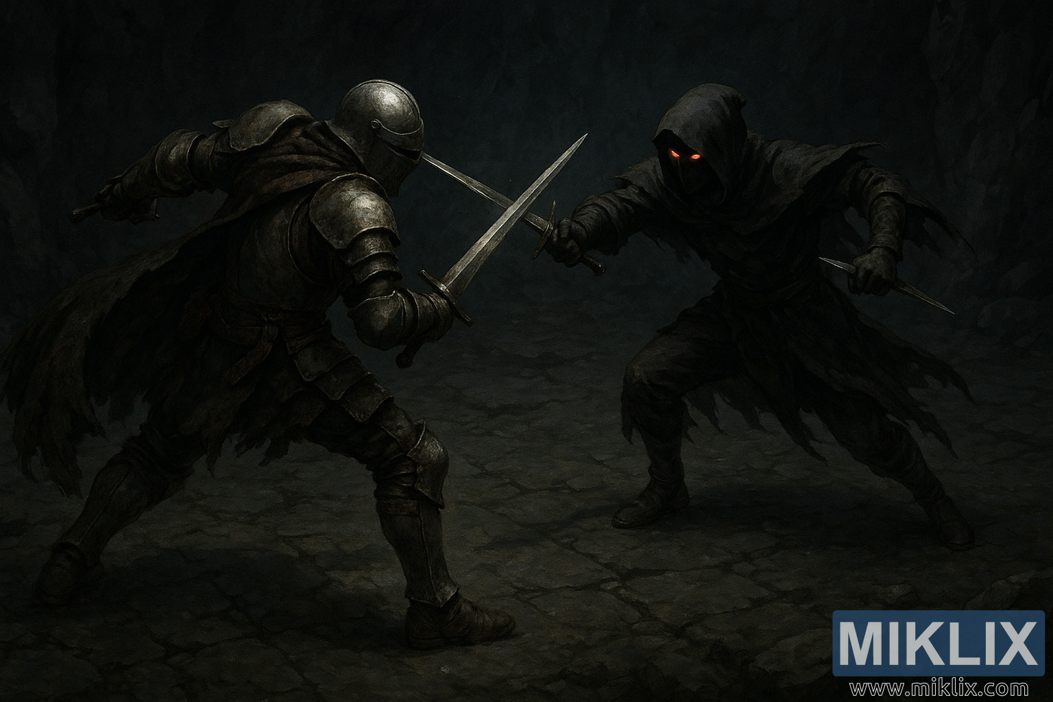 Tegenover de Bezoedelde, aan de rechterkant, reageert de Zwarte Mes-huurmoordenaar in beweging. Gehuld in gelaagde, schaduwabsorberende stof, lijkt de gestalte van de huurmoordenaar bijna uit de duisternis zelf gehouwen. De kap verbergt alle gelaatstrekken, behalve een paar gloeiende rode ogen, die scherp afsteken tegen het gedempte licht en onmiddellijk de aandacht vestigen op de dreiging. De huurmoordenaar hanteert een dolk in elke hand, met zijn armen gespreid in een verdedigende maar dodelijke houding. Eén dolk heft zich op om het zwaard van de Bezoedelde te onderscheppen, metaal tegen metaal, terwijl het tweede mes laag en klaar wordt gehouden, gereed voor een tegenaanval gericht op een opening in de verdediging van de Bezoedelde.