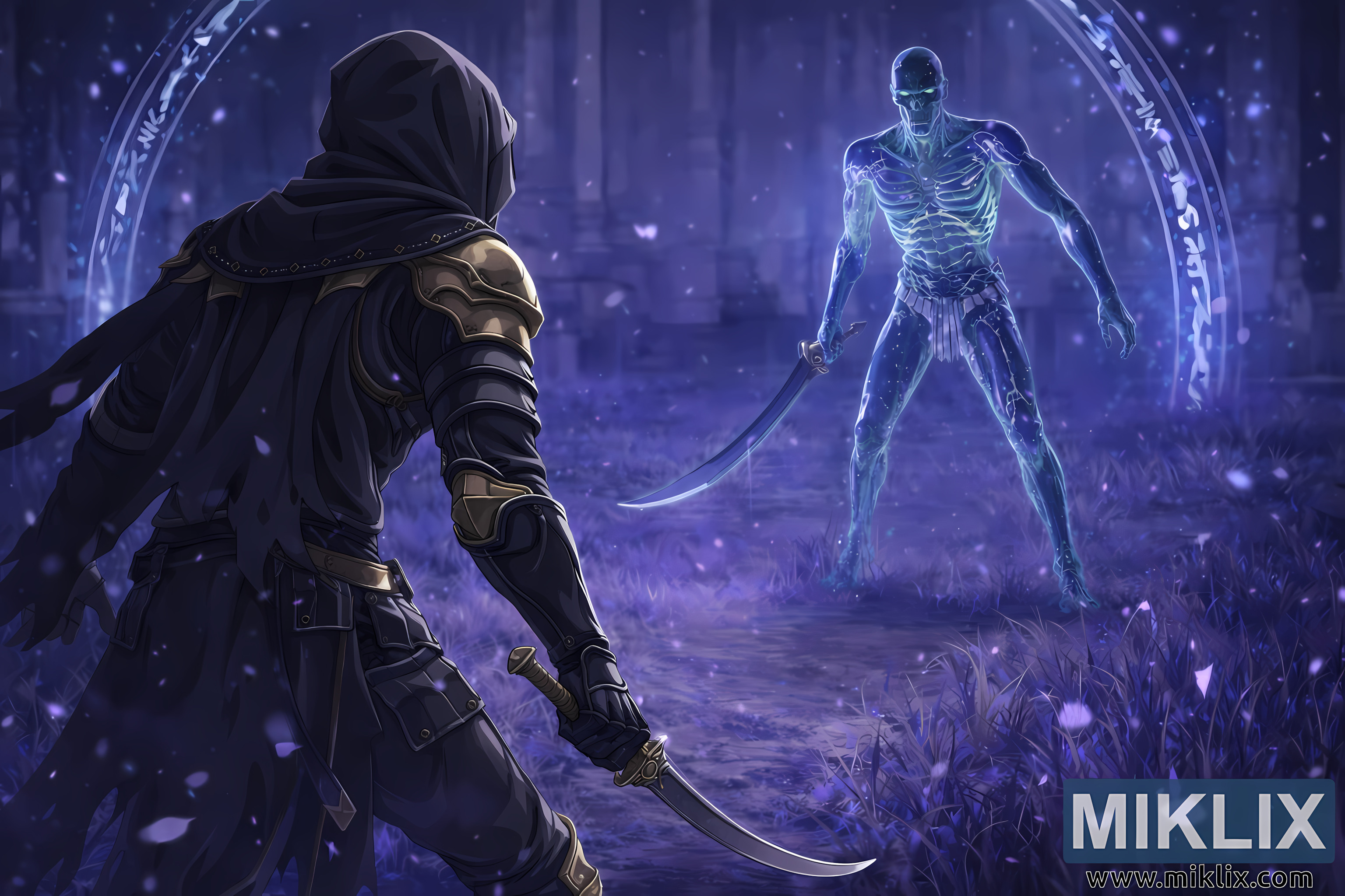 Belichting en kleur verenigen de scène. Koele blauwen en paarsen domineren het kleurenpalet en werpen zachte highlights op de randen van de pantsers, wapens en de contouren van beide figuren, terwijl gezichten en fijnere details gedeeltelijk verborgen blijven. Het scherpe contrast tussen het donkere, schaduwabsorberende pantser van de Tarnished en de stralende, spookachtige gedaante van de Onyx Lord benadrukt visueel de botsing tussen sluipen en magische macht. Over het geheel genomen legt de afbeelding een stil, ingehouden moment van anticipatie vast, waarin beide strijders met waakzame intentie voorwaarts gaan, zich er volledig van bewust dat de volgende beweging de stilte zal verbreken en in gewelddadige actie zal veranderen.