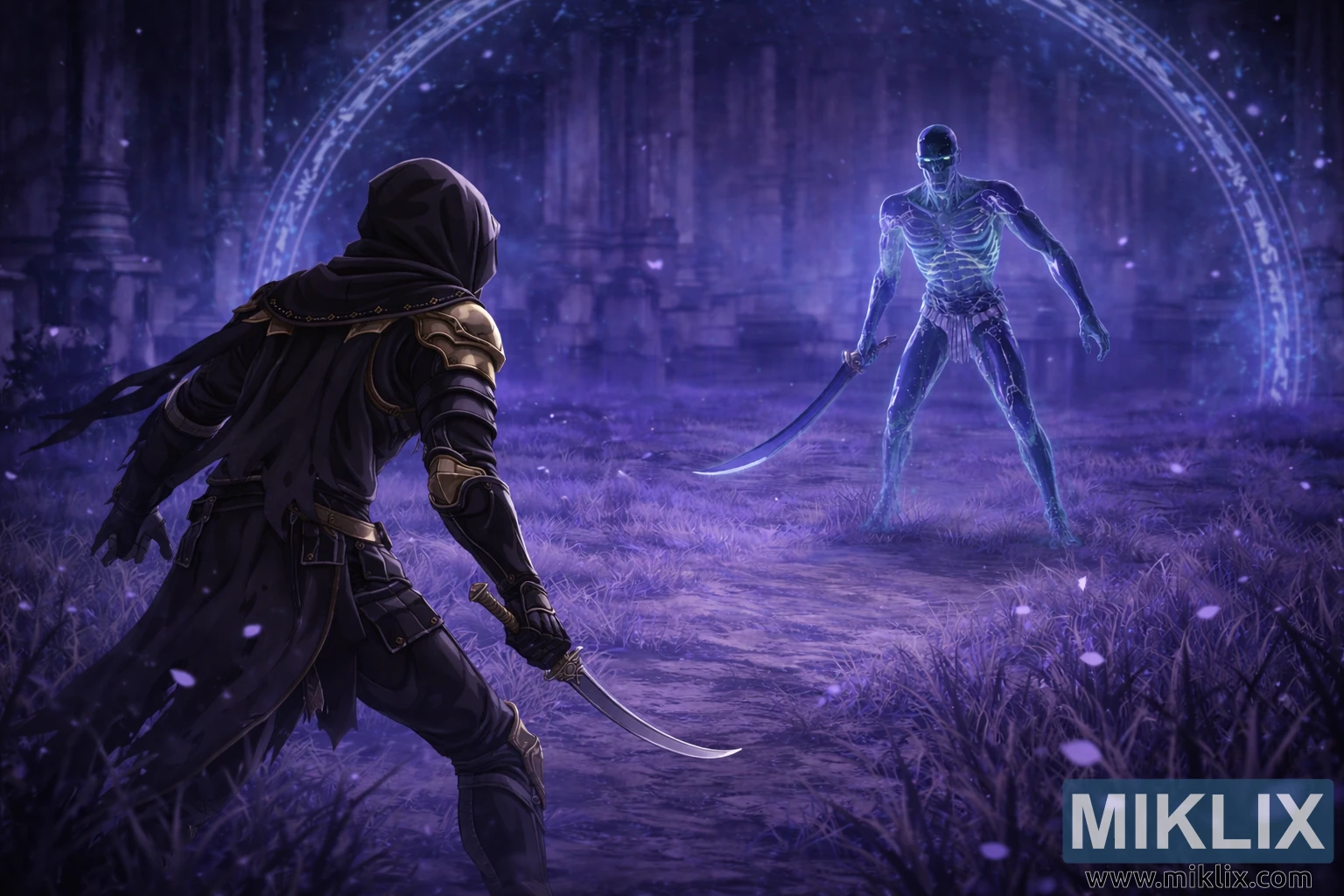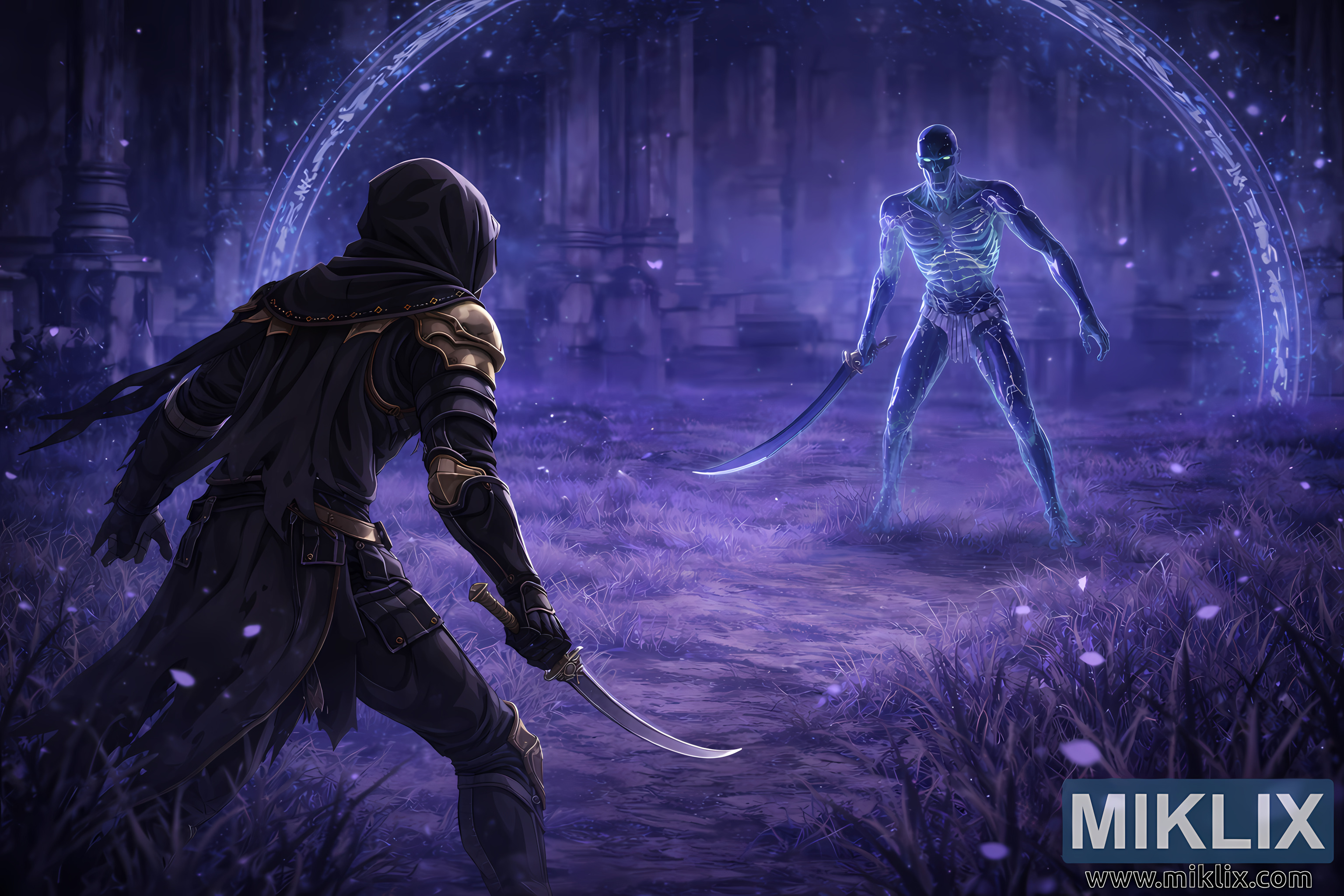 Belichting en kleur verenigen de compositie. Koele blauwen en paarsen domineren het kleurenpalet en werpen zachte highlights langs de randen van de pantsers, wapens en de contouren van beide figuren, terwijl gezichten en fijne details gedeeltelijk verborgen blijven. Het contrast tussen het donkere, schaduwrijke pantser van de Verdorvene en de stralende, spookachtige gedaante van de Onyx Heer onderstreept de thematische botsing tussen sluipen en magische krachten. Over het geheel genomen versterkt het bredere cameraperspectief het gevoel van schaal, spanning en onvermijdelijkheid, en legt het een adembenemend moment vast waarop beide krijgers voorzichtig oprukken, zich er volledig van bewust dat de volgende stap een gewelddadige beweging zal ontketenen.