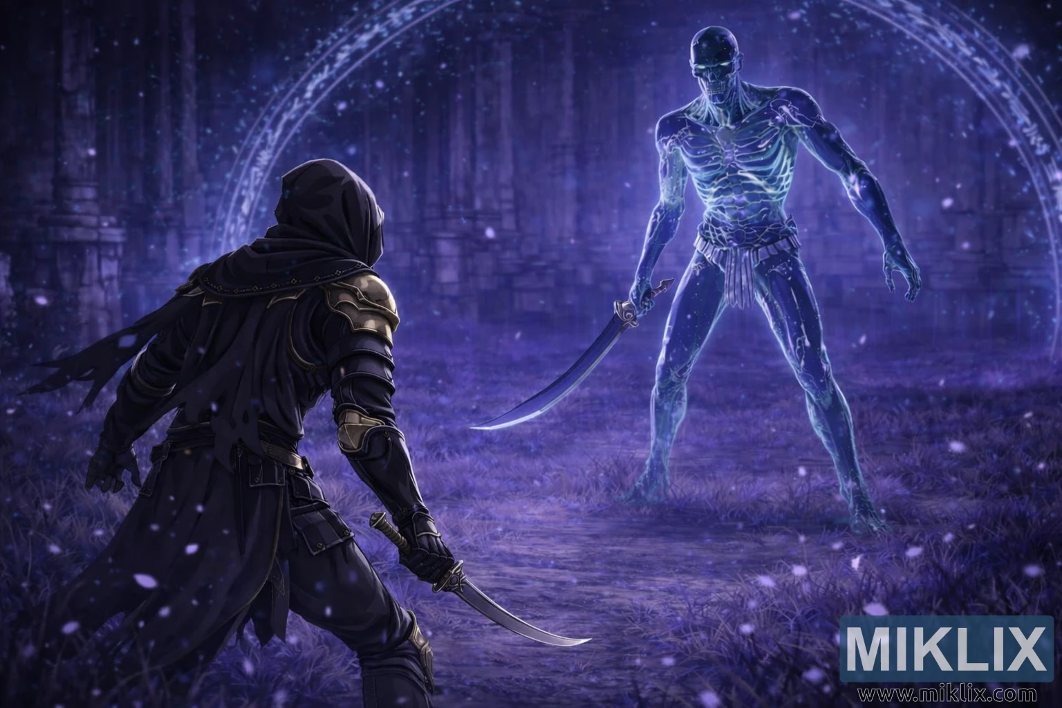 Het bredere perspectief onthult meer van de Royal Grave Evergaol zelf. De grond tussen de twee figuren strekt zich uit, bedekt met zacht gloeiend, paars getint gras dat zwakjes glinstert. Kleine, lichtgevende deeltjes zweven door de lucht als magisch stof of vallende bloemblaadjes, wat het gevoel van stilstaande tijd versterkt. Op de achtergrond rijzen torenhoge stenen muren, zuilen en oude architectonische details op in een blauwachtige waas, waardoor de arena diepte krijgt en een gevoel van ouderdom en isolement oproept. Achter de Onyx Lord strekt een enorme cirkelvormige runenbarrière zich uit over het tafereel, waarvan de gloeiende symbolen de magische grens van de Evergaol markeren en de baas visueel omlijsten als een symbool van opsluiting en macht.