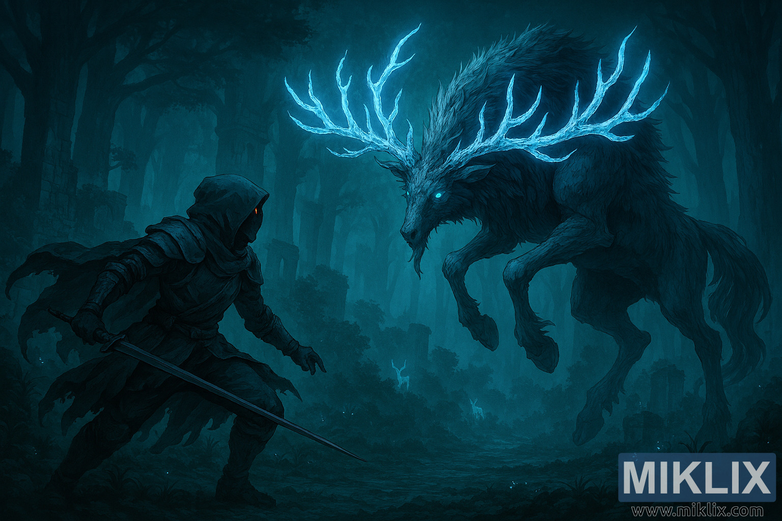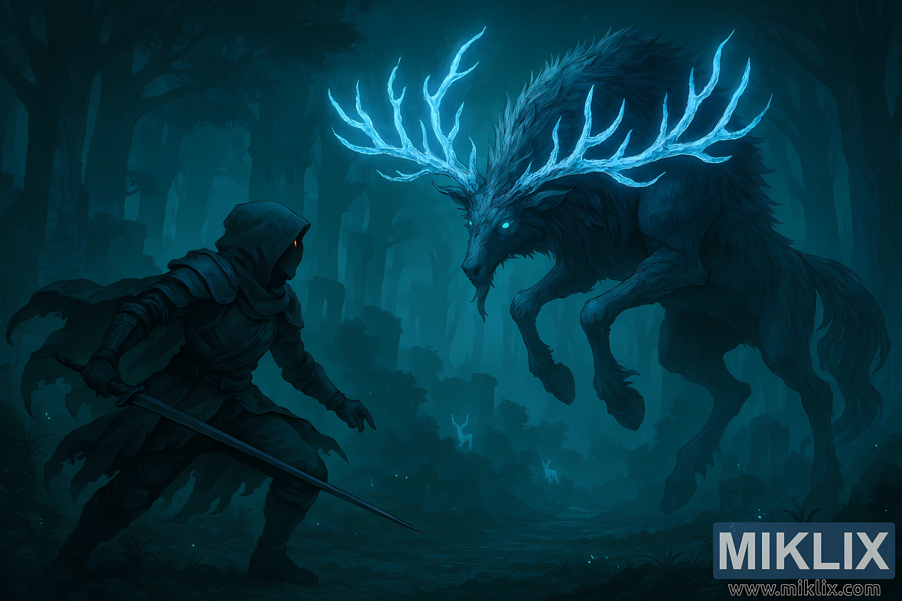 De achtergrond dompelt de kijker onder in de mystieke sfeer van Nokrons Hallowhorn Grounds. Torenhoge, knoestige bomen reiken tot in de mistige hemel, hun stammen kronkelig en oeroud. De bosbodem is bezaaid met bioluminescente vegetatie en afbrokkelende stenen ruïnes, waaronder fragmenten van een gebroken pilaar achter de Geest. Flarden mist drijven door het tafereel, verzachten de contouren van de omgeving en versterken de dromerige sfeer. In de verte flikkeren spookachtige, hertachtige silhouetten tussen de bomen, wat zinspeelt op de heerschappij van de Geest over voorouderlijke zielen.