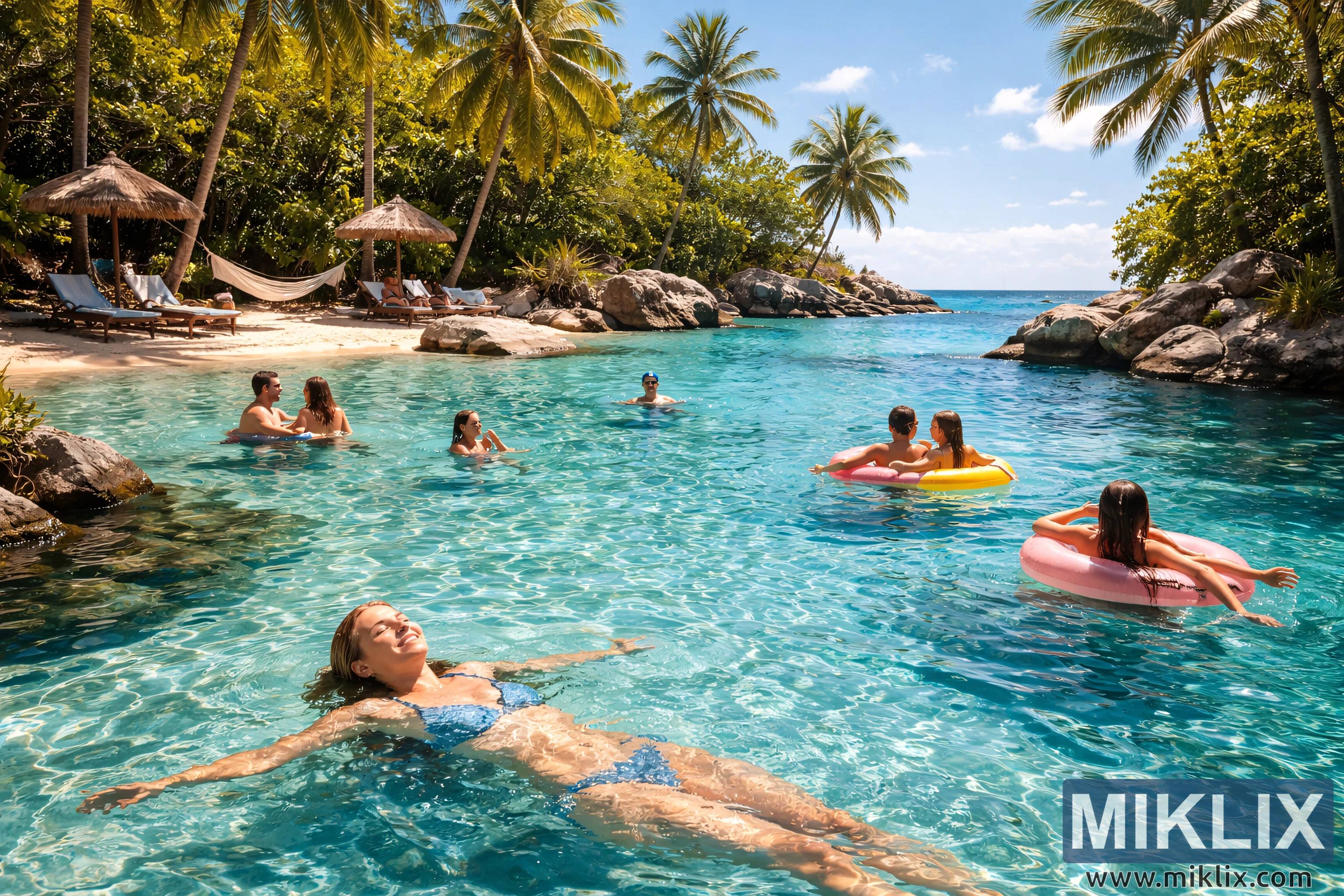 Een breedbeeldfoto van mensen die drijven, zwemmen en rusten op een zonnig tropisch strand, waarbij de kalmerende, stressverlagende sfeer van warm turquoise water en met palmen omzoomde oevers wordt benadrukt.