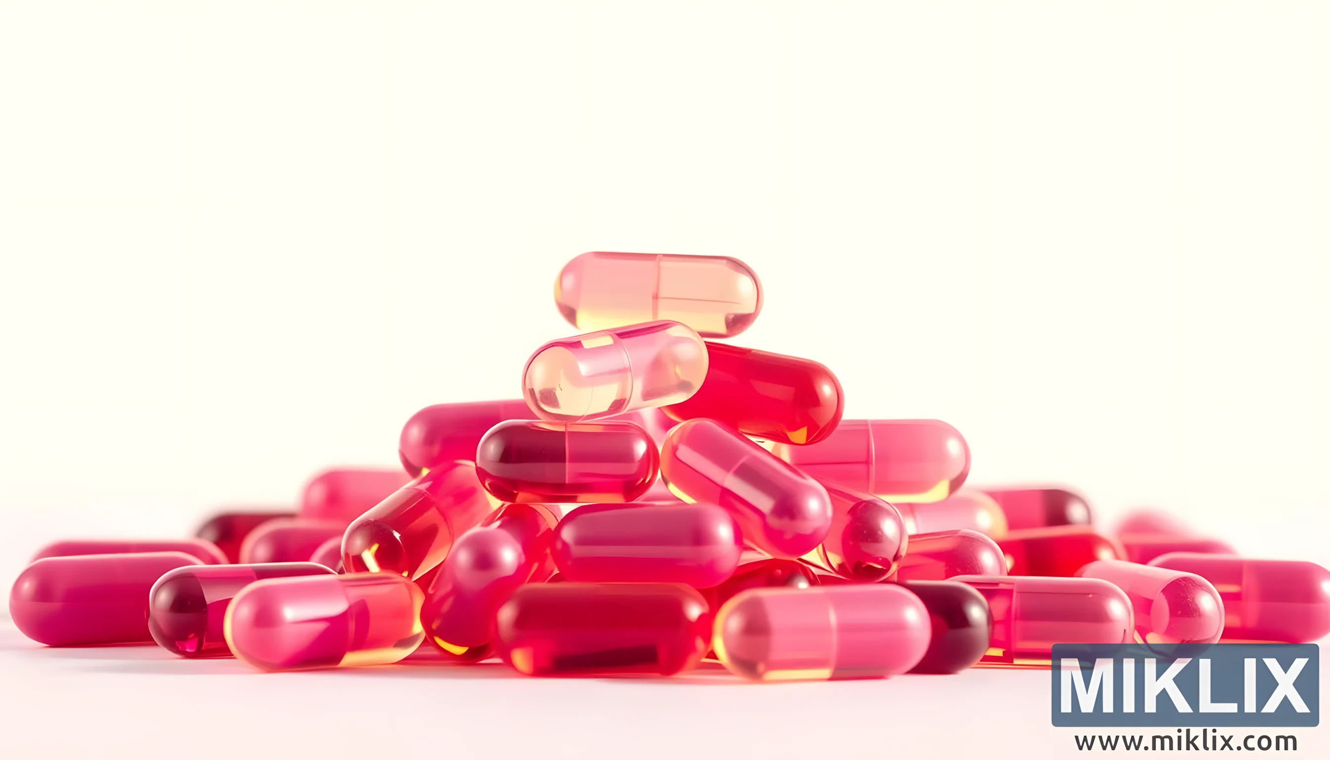 Naast het puur visuele aspect vertelt de compositie een dieper verhaal over gezondheidssupplementen en de rol van leucine in voeding. Leucine, een vertakt aminozuur, wordt vaak geassocieerd met spiergroei, herstel en de optimalisatie van de eiwitsynthese, waardoor het een belangrijk onderdeel is van sportsupplementen en algemeen welzijn. De bewuste plaatsing van de capsules in een kleine piek kan symbolisch worden geïnterpreteerd en kracht, energie en het verbeteren van fysieke prestaties suggereren. De levendige roze tinten roepen vitaliteit en leven op, terwijl de ongerepte schoonheid van de achtergrond wetenschappelijke geloofwaardigheid en betrouwbaarheid suggereert. De afbeelding presenteert de capsules daarom niet alleen als visueel interessante objecten, maar communiceert ook een bredere boodschap over hun functie en voordelen.