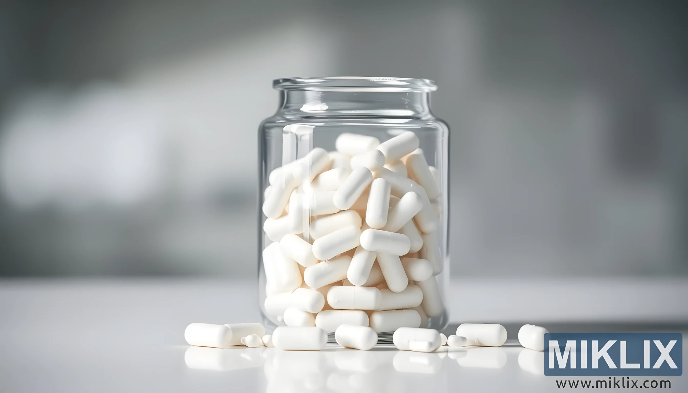 De afbeelding toont een minimalistische maar krachtige compositie, gecentreerd rond een transparante glazen container die tot de rand gevuld is met smetteloos witte capsules. De container staat op een smetteloos wit oppervlak, en de helderheid en eenvoud benadrukken de capsules erin. Elke capsule, met zijn gladde, uniforme coating en compacte formaat, is identiek aan de volgende en vormt samen een ordelijke en samenhangende weergave die consistentie, precisie en betrouwbaarheid suggereert. Een paar capsules liggen verspreid over de bodem van de container, wat een subtiele touch van realisme toevoegt aan de overigens zorgvuldig geordende scène, terwijl het ook verwijst naar toegankelijkheid en dagelijks gebruik.