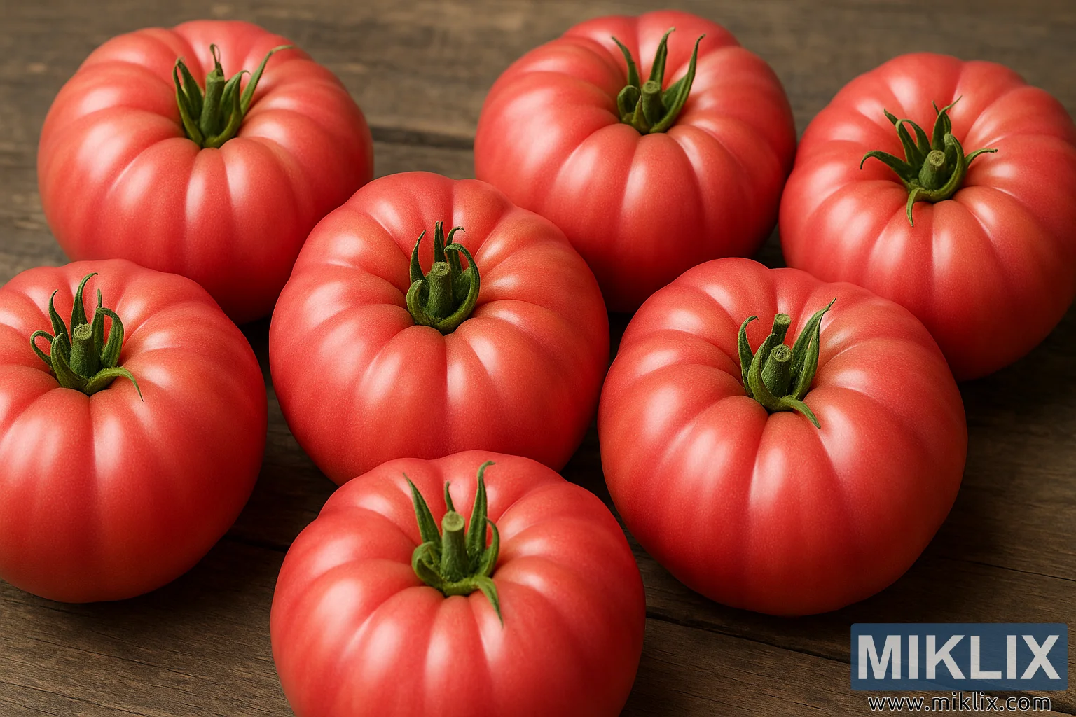 Deze foto toont een close-up, in hoge resolutie, van verschillende rijpe Brandywine-tomaten, gerangschikt in een losse tros op een rustiek houten oppervlak. Elke tomaat vertoont de klassieke kenmerken van de Brandywine-variëteit, waaronder een kenmerkende roze tint die subtiel varieert van zachtroze tot diepere koraalachtige tinten. De tomaten zijn groot en vol, met een uitgesproken ribbelstructuur die een gebeeldhouwde, bijna gecanneleerde uitstraling creëert. Hun schil ziet er glad en strak uit, met een natuurlijk matte afwerking die het zachte, diffuse licht in subtiele highlights vangt. De stelen zitten nog steeds aan elke vrucht vast, met felgroene kelkblaadjes die licht krullen aan de uiteinden en scherp contrasteren met de warme kleur van de tomaten.