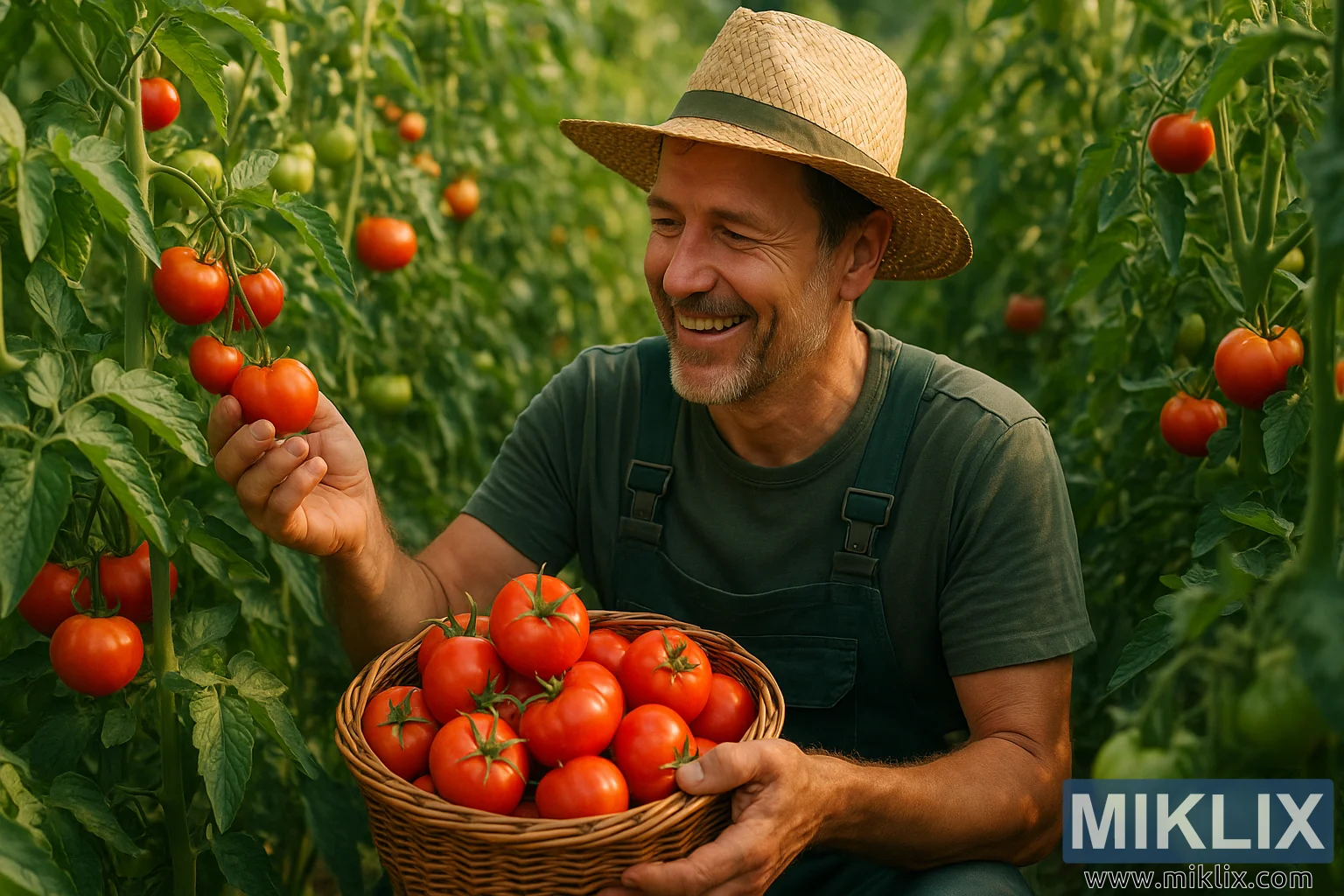 Een vrolijke tuinier oogst rijpe tomaten van bloeiende planten, wat de schoonheid en de beloning van het kweken van kwaliteitstomatensoorten laat zien.
