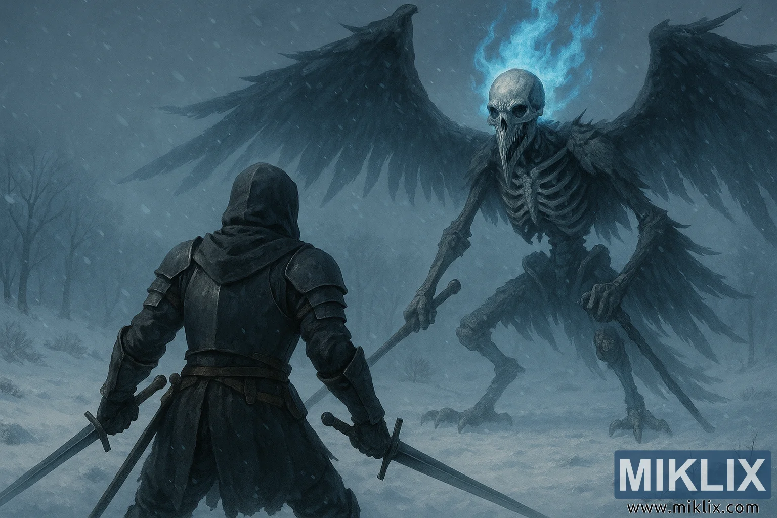 ଏକ ନାଟକୀୟ ଏଲଡେନ୍ ରିଙ୍ଗ-ପ୍ରେରିତ ଦୃଶ୍ୟ ଯେଉଁଥିରେ ଜଣେ କଳା ଛୁରୀ-ଶୈଳୀର ଯୋଦ୍ଧା ଏକ ବରଫ, ଝଡ଼-ପ୍ରବଣ ଭୂଦୃଶ୍ୟ ମଧ୍ୟରେ ଏକ ବାଡ଼ି ଧରି ଏକ କଙ୍କାଳ ଡେଥ୍ ରାଇଟ୍ ପକ୍ଷୀକୁ ସାମ୍ନା କରୁଥିବାର ଚିତ୍ରଣ କରାଯାଇଛି।