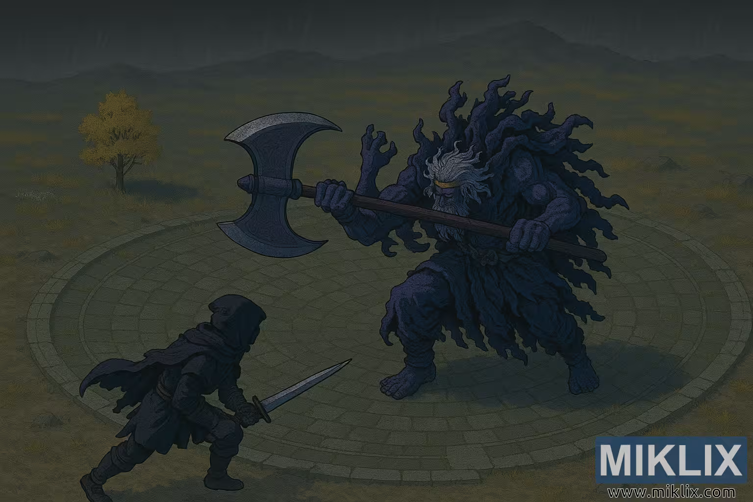 ଏହି ଚିତ୍ରଟି ଏକ ଆନିମେ-ପ୍ରେରିତ ଅନ୍ଧକାର କାଳ୍ପନିକ ଯୁଦ୍ଧ ଦୃଶ୍ୟକୁ ଏକ ପଛକୁ ଟାଣି ନିଆଯାଇଥିବା, ଉଚ୍ଚ ଆଇସୋମେଟ୍ରିକ୍ ଦୃଷ୍ଟିକୋଣରୁ ଦେଖାଯାଇଛି, ଯାହା ପରିବେଶ ଏବଂ ଯୋଦ୍ଧାମାନଙ୍କ ମଧ୍ୟରେ ଆସନ୍ନ ସ୍କେଲ୍ ପାର୍ଥକ୍ୟ ଉଭୟକୁ ଗୁରୁତ୍ୱ ଦିଏ। କେନ୍ଦ୍ରରେ ଏକ ବୃତ୍ତାକାର ପଥର ପ୍ଲାଟଫର୍ମ ଅଛି ଯାହା ଜୀର୍ଣ୍ଣ ଚିନାରୀର ସମକେନ୍ଦ୍ରିକ ବଳୟରେ ଗଠିତ, ଯାହା ବାହ୍ୟ ଜଗତରୁ ଦୂରରେ ଏକ ପ୍ରାଚୀନ ଦ୍ୱନ୍ଦ୍ୱପୂର୍ଣ୍ଣ ଭୂମିକୁ ସୂଚାଇଥାଏ। ଆଖଡ଼ାଟି ବିରଳ, ପବନ ପ୍ରବାହିତ ଘାସଭୂମି ଦ୍ୱାରା ଘେରି ରହିଛି ଯାହା ମୌନ ସୁନା ଏବଂ ମାଟିଆ ରଙ୍ଗରେ ରେଣ୍ଡରିତ ହୋଇଛି, ଏକ ଏକକ ସୁନା-ପତ୍ରଯୁକ୍ତ ଗଛ ମଧ୍ୟ ଦୂରତାରେ ହଜିଯାଇଥିବା ଅନୁଗ୍ରହର ଏକ ଶାନ୍ତ ପ୍ରତୀକ ଭାବରେ ଠିଆ ହୋଇଛି। ନିମ୍ନ ପାହାଡ଼ଗୁଡ଼ିକ ଏକ ଭାରୀ, ମେଘୁଆ ଆକାଶ ତଳେ ପୃଷ୍ଠଭୂମିରେ ଫିକା ପଡ଼ିଯାଏ ଯାହା ବର୍ଷା କିମ୍ବା ପଡ଼ିଥିବା ପାଉଁଶ ପରି ଉଲ୍ଲମ୍ବ ଛାୟା ସହିତ ବିସ୍ତାରିତ, ଏକ ଏଭରଗାଲର ଦମନକାରୀ ପରିବେଶକୁ ଦୃଢ଼ କରେ।
