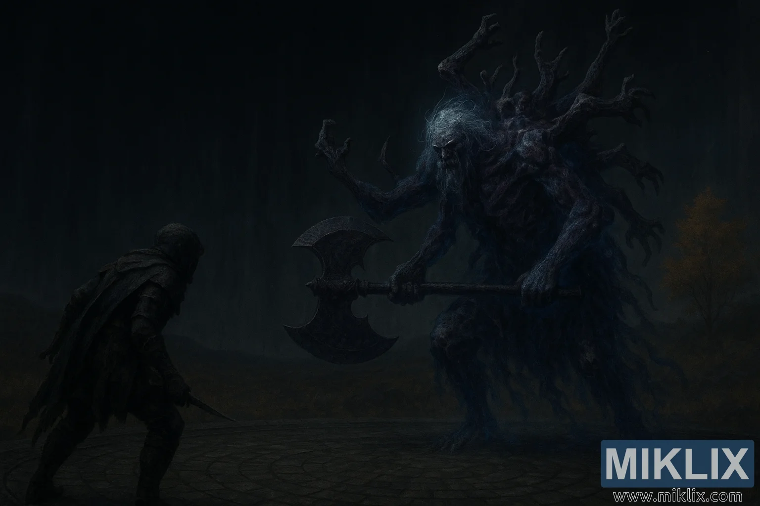 ଅର୍ଦ୍ଧ-ବାସ୍ତବବାଦୀ ଏଲଡେନ୍ ରିଙ୍ଗ ଫ୍ୟାନ୍ ଆର୍ଟରେ କଳା ଛୁରୀରେ ଟାର୍ଣ୍ଣିସ୍ଡ୍ କବଚକୁ ଏକ ଅନ୍ଧାର ଏଭରଗାଲ୍ ଆରେନାରେ ଏକ ସଠିକ୍ ଭାବରେ ଚାଳିତ ଦୁଇ ହାତ କୁରାଢ଼ି ସହିତ ଏକ ବିଚିତ୍ର, ବହୁ-ଅଙ୍ଗ ବିଶିଷ୍ଟ ଗୋଡେଫ୍ରୟ ଗ୍ରାଫ୍ଟେଡ୍ ସହିତ ଯୁଦ୍ଧ କରୁଥିବା ଦର୍ଶାଯାଇଛି।