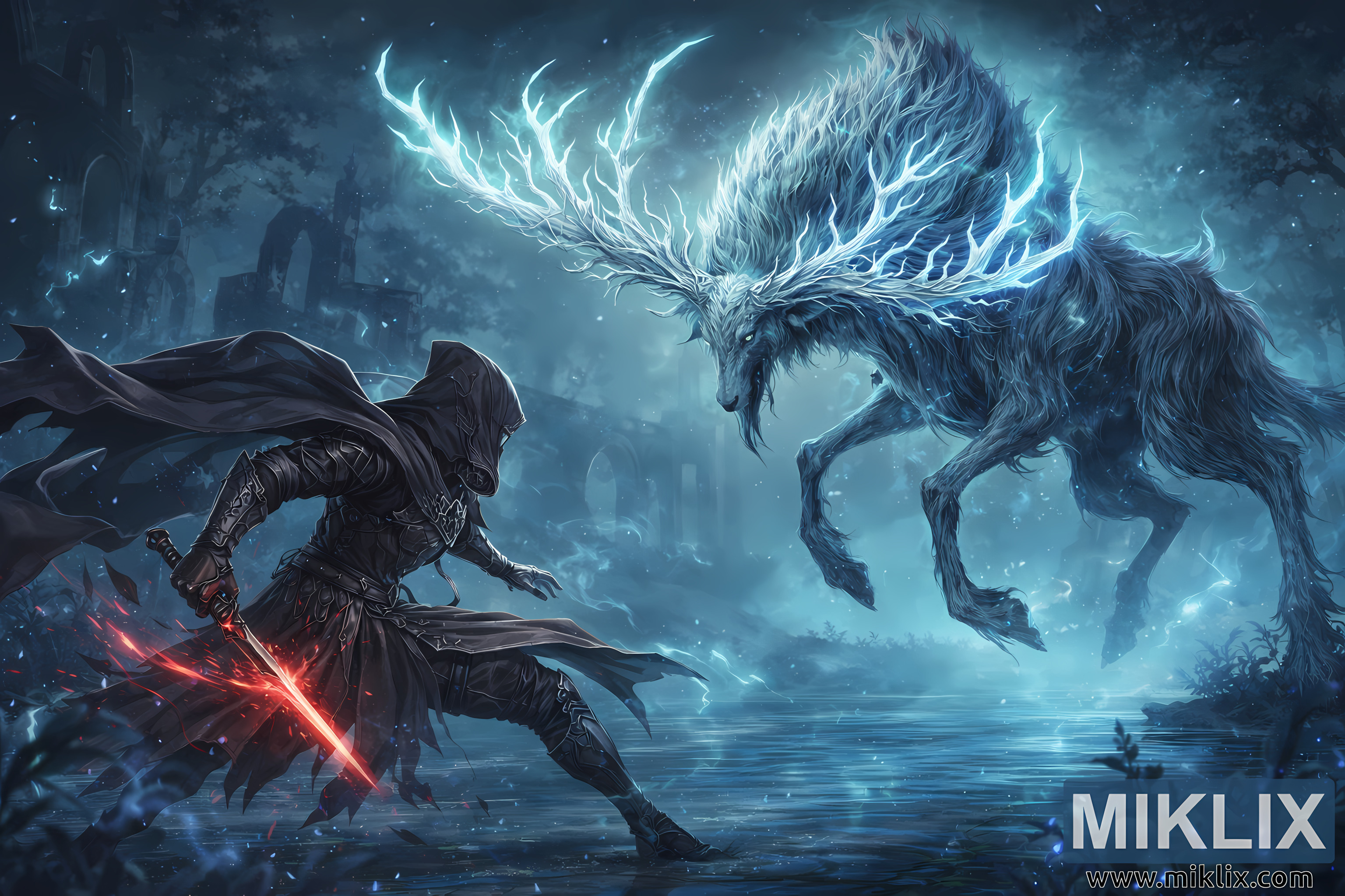 ସେମାନଙ୍କ ପଛରେ, ନୋକ୍ରନର ଧ୍ୱଂସପ୍ରାପ୍ତ ସ୍ଥାପତ୍ୟ ଦ୍ୱନ୍ଦ୍ୱକୁ ଫ୍ରେମ୍ କରେ। ଉଚ୍ଚ, ଭଙ୍ଗା ତୋରଣଗୁଡ଼ିକ ଏକ ପତିତ ବିଶାଳକାୟଙ୍କ ପଞ୍ଜରା ପରି ଘୂରି ବୁଲୁଛି, ଏବଂ ବାୟୋଲୁମିନେସେଣ୍ଟ ଉଦ୍ଭିଦଗୁଡ଼ିକ ପଥରଗୁଡ଼ିକ ସହିତ ଘନ, ନୀଳ ଏବଂ ଟିଲ୍ସରେ ହାଲୁକା ଭାବରେ ଝଲସୁଛି। ବାୟୁ ଯାଦୁରେ ଘନ, କୁହୁଡ଼ି ଉଭୟ ଯୋଦ୍ଧାଙ୍କ ଚାରିପାଖରେ ଘନ ଯେପରି ଭୂମି ନିଜେ ମୁକାବିଲା ଦେଖୁଛି। ଏକାଠି, ଉପାଦାନଗୁଡ଼ିକ ଏକ ନାଟକୀୟ ସାରଣୀ ସୃଷ୍ଟି କରନ୍ତି: ଭୂତ ନୀଳ ଦିବ୍ୟତା ବିରୁଦ୍ଧରେ ଅଗ୍ନି-ଲାଲ ଇସ୍ପାତ, ମର୍ତ୍ତ୍ୟର ଇଚ୍ଛା ଅତୀତର ଏକ ଅମର ପ୍ରତିଧ୍ୱନି ସହିତ ଧକ୍କା ହେଉଛି। ପ୍ରତିଛବିଟି ଗୋଟିଏ ମୁହୂର୍ତ୍ତ ପରି କମ୍ ଏବଂ ସମୟ ମଧ୍ୟରେ ଜମାଟ ବାନ୍ଧିଯାଇଥିବା ଏକ କିମ୍ବଦନ୍ତୀ ପରି ଅଧିକ ଅନୁଭବ ହୁଏ, ଭୂମି ମଧ୍ୟରେ ବଞ୍ଚିବା ଏବଂ ଆତ୍ମସମର୍ପଣ ମଧ୍ୟରେ ଭଙ୍ଗୁର ରେଖାର ଏକ ଭୟଙ୍କର ସ୍ମରଣକାରୀ।