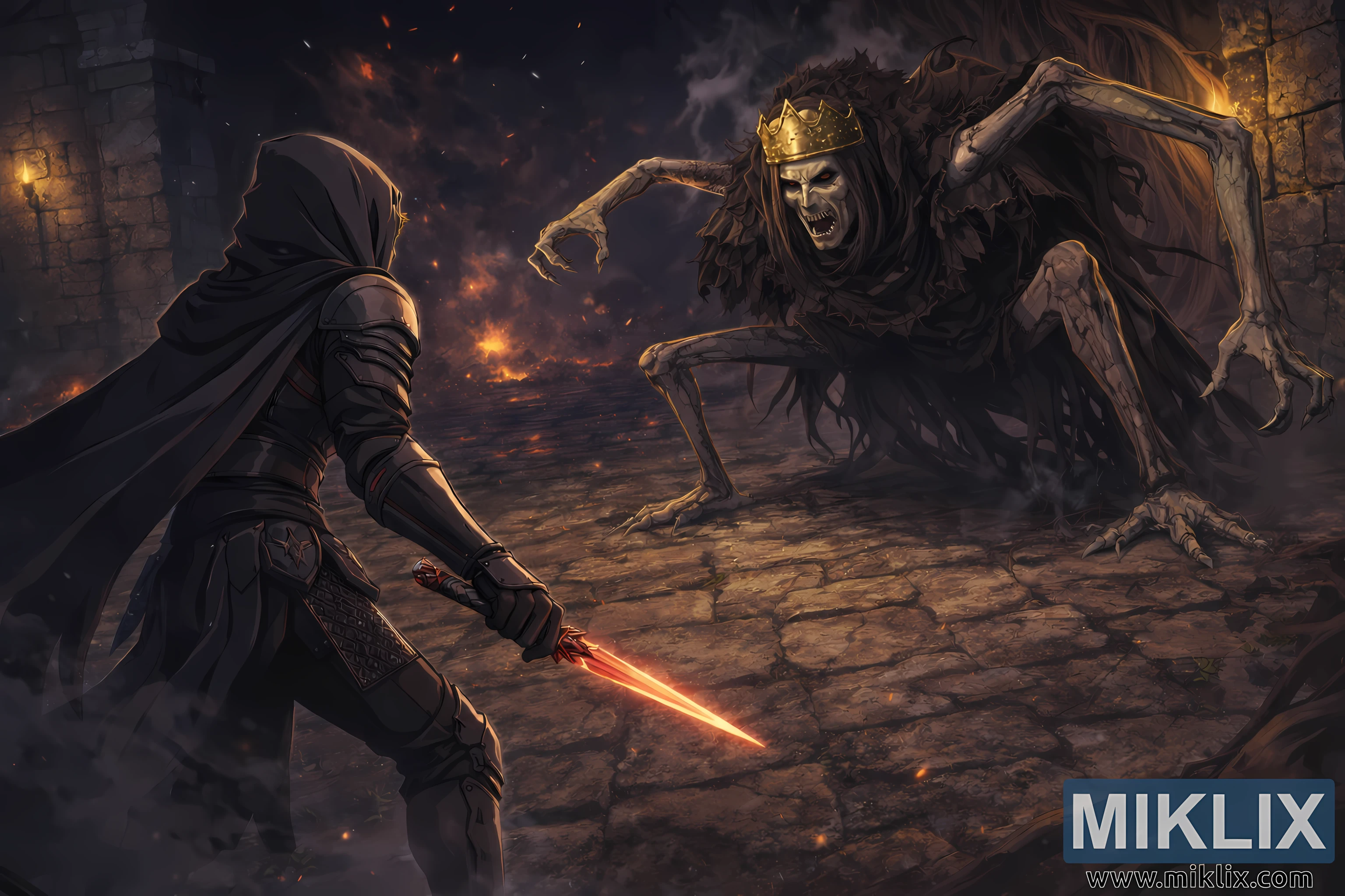 ଏହି ଚିତ୍ରଟି ଏକ ଉଚ୍ଚ-ରିଜୋଲ୍ୟୁସନ୍, ଭୂଦୃଶ୍ୟ-ମୁଖୀ ଆନିମେ-ଶୈଳୀର ପ୍ରଶଂସକ କଳା ଚିତ୍ରଣ ଯାହା ଏଲଡେନ୍ ରିଙ୍ଗର ଅଶୁଭ କିଙ୍ଗସ୍ରେଲ୍ମ ଧ୍ୱଂସାବଶେଷରେ ସେଟ୍ କରାଯାଇଛି। ଏହା ଯୁଦ୍ଧ ଆରମ୍ଭ ହେବା ପୂର୍ବରୁ ଏକ ନାଟକୀୟ ନିରବତା ମୁହୂର୍ତ୍ତକୁ କଏଦ କରେ, ଗତି ଅପେକ୍ଷା ସ୍କେଲ୍, ବାୟୁମଣ୍ଡଳ ଏବଂ ମାନସିକ ଉତ୍ତେଜନା ଉପରେ ଧ୍ୟାନ ଦେଇ। ଧ୍ୱଂସପ୍ରାପ୍ତ ଅଗଣା ପୁରୁଣା ପଥର କାନ୍ଥ ଦ୍ୱାରା ଘେରି ରହିଛି ଯାହା ପୁରୁଣା ହୋଇ ଫାଟି ଯାଇଛି ଏବଂ ଆଂଶିକ ଭାବରେ ଘନ, କଣ୍ଟା ଗଛ ମୂଳ ଦ୍ୱାରା ଗ୍ରାସ ହୋଇଛି। କାନ୍ଥ ସହିତ ଲଗାଯାଇଥିବା ଝଲସୁଥିବା ଟର୍ଚ୍ଚଗୁଡ଼ିକ ଉଷ୍ମ କମଳା ଆଲୋକ ପକାଇଥାଏ ଯାହା ଚାରିପାଖର ଅନ୍ଧକାରକୁ କଷ୍ଟକର ଭାବରେ ଭେଦ କରେ, ଯେତେବେଳେ ଜଳୁଥିବା ଅଙ୍ଗାର ଏବଂ ପ୍ରବାହିତ ଧୂଆଁ ବାୟୁମଣ୍ଡଳକୁ ପୂର୍ଣ୍ଣ କରିଦିଏ, ଯାହା କ୍ଷୟ ଏବଂ ବିପଦର ଏକ ଭାବନା ସୃଷ୍ଟି କରେ।