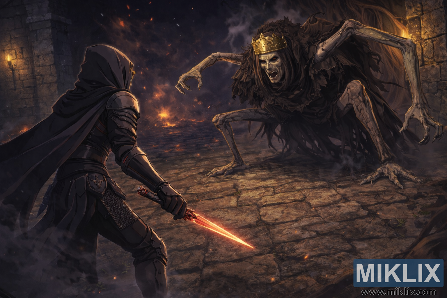 ମହାକାବ୍ୟିକ ଆନିମେ-ଶୈଳୀର ଏଲଡେନ୍ ରିଙ୍ଗ ଫ୍ୟାନ୍ ଆର୍ଟ ଯାହା ଛାୟାମୟ କିଙ୍ଗସ୍ରେଲ୍ମ ଧ୍ୱଂସାବଶେଷ ମଧ୍ୟରେ ଟାର୍ଣ୍ଣିସ୍ଡ ଏବଂ ଏକ ବିସ୍ତାରିତ, ଭୟଙ୍କର ରୟାଲ୍ ରେଭେନାଣ୍ଟ ମଧ୍ୟରେ ଏକ ଯୁଦ୍ଧ ପୂର୍ବର ଉତ୍ତେଜନାପୂର୍ଣ୍ଣ ସ୍ଥିତିକୁ ଚିତ୍ରଣ କରେ।