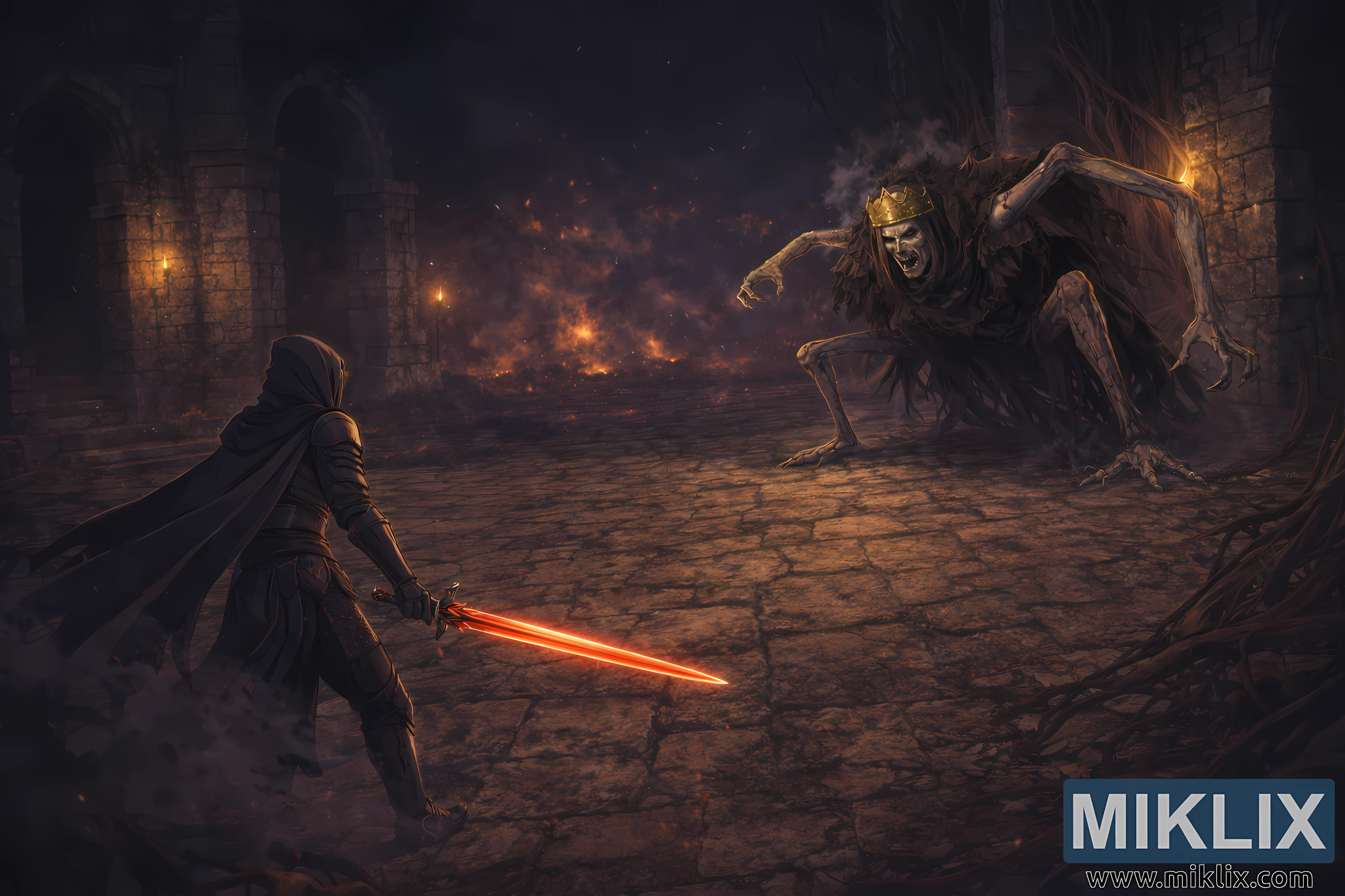 ସିନେମାଟିକ୍ ଆନିମେ-ଶୈଳୀର ଏଲଡେନ୍ ରିଙ୍ଗ ଫ୍ୟାନ୍ ଆର୍ଟ, ଏକ ଟାଣିଆ ଦୃଶ୍ୟ ସହିତ, ଯୁଦ୍ଧ ପୂର୍ବରୁ କିଙ୍ଗସ୍ରେଲମର ମଶାଲ-ଜଳିତ ଧ୍ୱଂସାବଶେଷ ମଧ୍ୟରେ ଟାର୍ଣ୍ଣିସ୍ଡକୁ ଏକ ବିଶାଳ ରୟାଲ୍ ରେଭେନାଣ୍ଟର ମୁକାବିଲା କରୁଥିବା ଚିତ୍ରଣ କରୁଛି।