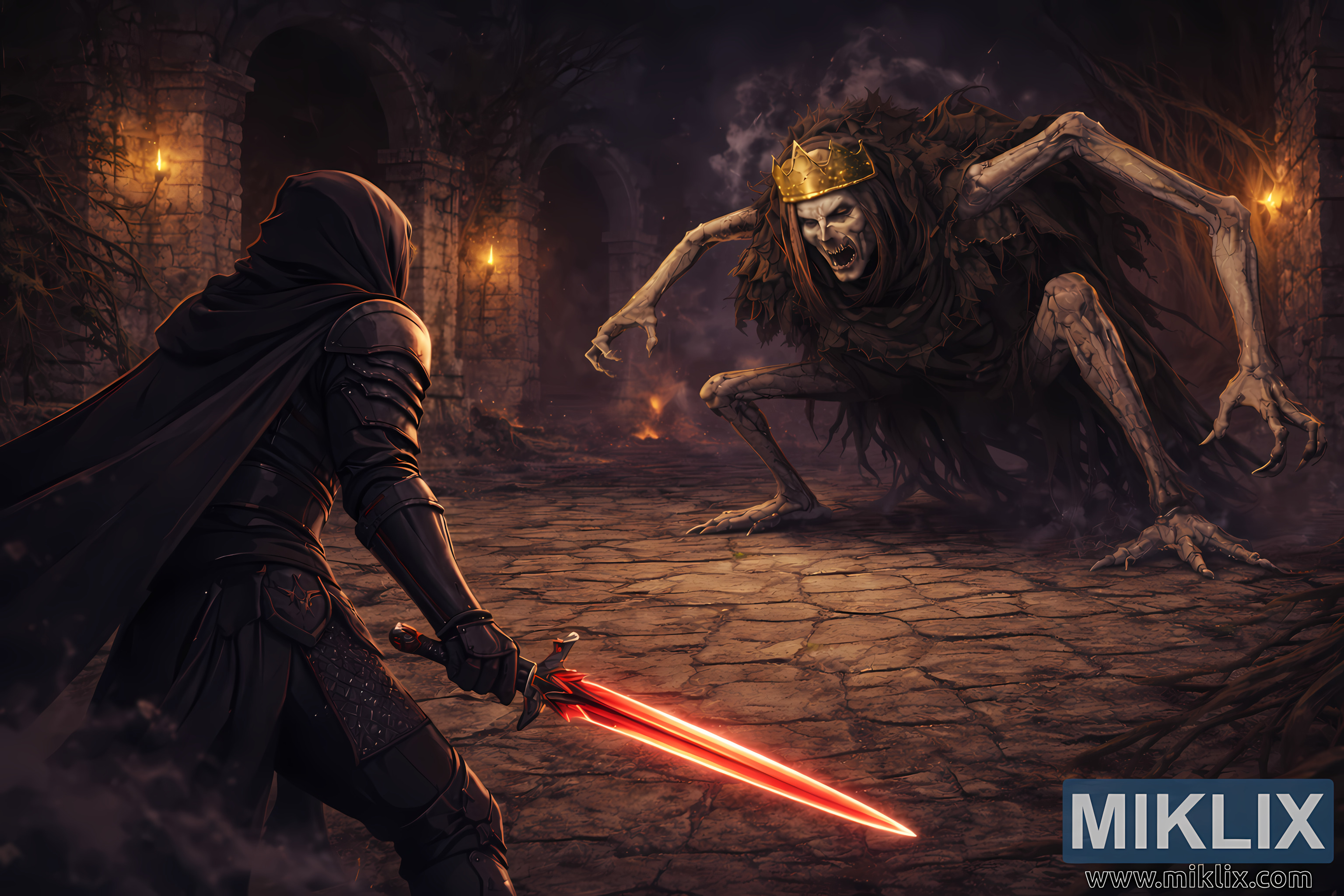 ଏହି ପରିବେଶଟି ଏକ ପ୍ରଶସ୍ତ, ପ୍ରାଚୀନ ପଥର ପ୍ରାଙ୍ଗଣ ଯାହା ଉଚ୍ଚ, ଭାଙ୍ଗିପଡ଼ିଥିବା କାନ୍ଥ ଏବଂ ଛାୟାଯୁକ୍ତ ତୋରଣ ଦ୍ୱାରା ଘେରି ରହିଛି। କାନ୍ଥବାଡ଼ ବହୁତ ଖରାପ, ଫାଟିଯାଇଥିବା ପଥର, ଅସମାନ ପଥର ଏବଂ ଘନ, କଣ୍ଟା ଗଛ ମୂଳ ଭୂମି ଦେଇ ଭାଙ୍ଗି କାନ୍ଥ ଉପରକୁ ଉଠିଛି। ତୋରଣ ସହିତ ଲଗାଯାଇଥିବା ଝଲସୁଥିବା ଟର୍ଚ୍ଚଗୁଡ଼ିକ ଉଷ୍ମ, କମଳା ଆଲୋକ ପକାଇଥାଏ ଯାହା ଚାରିପାଖର ଅନ୍ଧକାରକୁ କଷ୍ଟକର କରିଥାଏ। ଧୂଆଁ ବାୟୁ ମାଧ୍ୟମରେ ବହିଯାଏ, ଧ୍ୱଂସାବଶେଷ ଭିତରେ ଗଭୀରକୁ ଧୂଆଁଳା ନିଆଁରୁ ଉଜ୍ଜ୍ୱଳ ଅଙ୍ଗାର ବହନ କରେ। ବିସ୍ତାରିତ ପୃଷ୍ଠଭୂମି ସ୍ତରଯୁକ୍ତ ତୋରଣ, ରୁକ୍ଷ ପଥର ଗଠନ ଏବଂ ଗଭୀର ଛାୟା ପ୍ରକାଶ କରେ, ଯାହା ପରିବେଶର ବୟସ ଏବଂ କ୍ଷୟକୁ ଆହୁରି ଦୃଢ଼ କରେ।