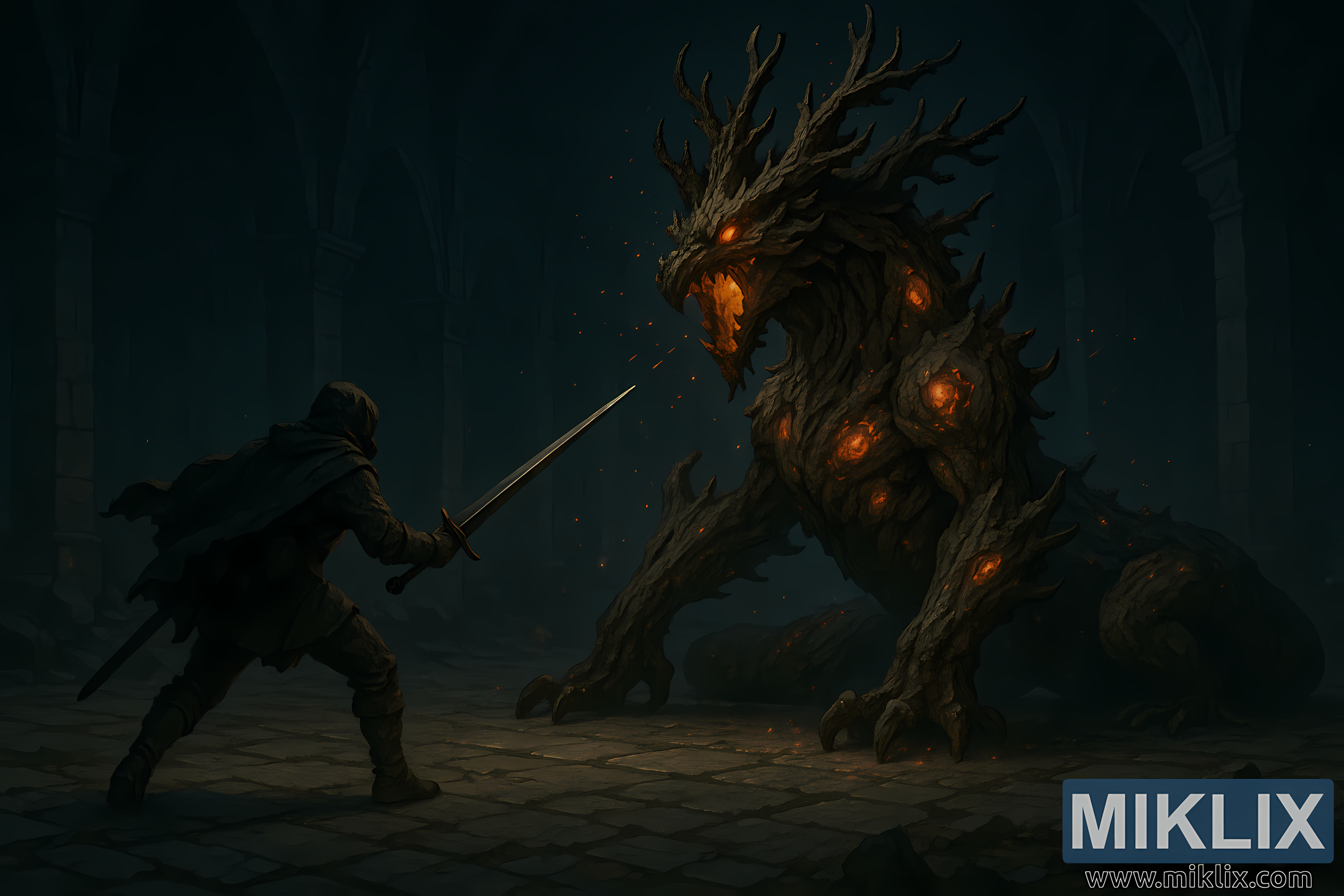 ଏକ ପ୍ରାଚୀନ ଭୂତଳ କାଟାକମ୍ବରେ ଏକ ବିଶାଳ, ଘାଆ ହୋଇଥିବା ଗଛ ପ୍ରାଣୀର ମୁକାବିଲା କରୁଥିବା ଯୁଦ୍ଧ ମଝି ସ୍ଥିତିରେ ଥିବା ଜଣେ କଳଙ୍କିତ ଯୋଦ୍ଧାଙ୍କ ବାସ୍ତବବାଦୀ ଅନ୍ଧକାର କାଳ୍ପନିକ କଳାକୃତି।