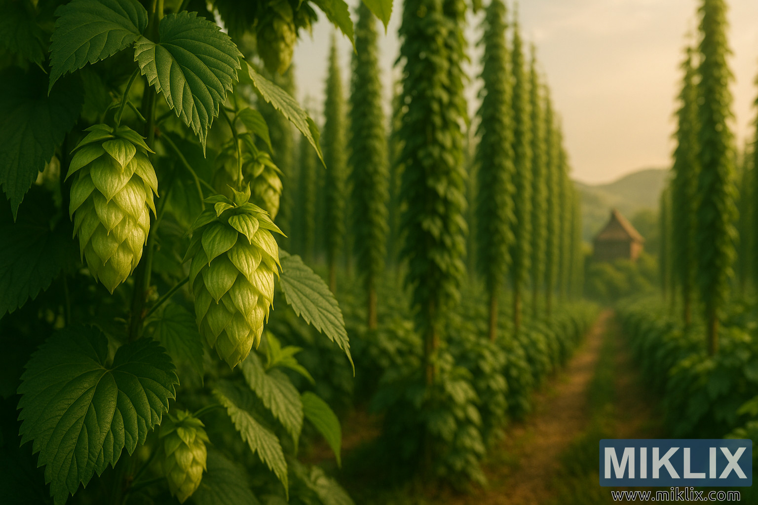 ପୃଷ୍ଠଭୂମିରେ, ଫଟୋଗ୍ରାଫ୍ ଅଧିକ ପ୍ରଭାବଶାଳୀ ଏବଂ ଟିକିଏ ଅସ୍ପଷ୍ଟ ହୋଇଯାଏ, ଏକ କୋମଳ ବୋକେ ପ୍ରଭାବ ସୃଷ୍ଟି କରେ ଯାହା ଦୃଷ୍ଟିକୁ ତୀକ୍ଷ୍ଣ ସମ୍ମୁଖଭାଗ ବିବରଣୀ ଆଡ଼କୁ ଫେରାଇ ଆକର୍ଷିତ କରେ। ହପ୍ସର ଅଦୃଶ୍ୟ ଧାଡି ମଧ୍ୟରେ ଅବସ୍ଥିତ ଏକ ଗ୍ରାମୀଣ ହପ୍ କିଲ୍ନ - ଏକ ଛୋଟ, କାଠ ଗଠନ ଯାହା ଏକ ପିଚୁ ଛାତ ସହିତ, ସଂରକ୍ଷଣ କିମ୍ବା ପ୍ରକ୍ରିୟାକରଣ ପୂର୍ବରୁ ଅମଳ ହୋଇଥିବା ହପ୍ସକୁ ଶୁଖାଇବା ପାଇଁ ବ୍ୟବହୃତ ହୋଇପାରେ। ଏହା ବ୍ୟତୀତ, ଏକ ପାଷ୍ଟେଲ୍ ଆକାଶ ବିରୁଦ୍ଧରେ ଗଡ଼ୁଥିବା ପାହାଡ଼ଗୁଡ଼ିକର ଏକ ପରିସର ଧୀରେ ଧୀରେ ଉଠିଥାଏ, ଉଷ୍ମ ଗୋଲାପୀ, କମଳା ଏବଂ ଅନ୍ଧକାର ସୁନା ସହିତ ରଙ୍ଗିତ। ଏହି ଧୂଆଁମୟ ଦୃଶ୍ୟ ଆଦର୍ଶ ପାଷ୍ଟୋରାଲ୍ ପରିବେଶକୁ ଉଜାଗର କରେ ଯେଉଁଥିରେ ଅମାଲିଆ ହପ୍ସ ସାଧାରଣତଃ ଚାଷ କରାଯାଏ - ଗ୍ରାମୀଣ, ଶାନ୍ତ ଏବଂ ପରମ୍ପରା ସହିତ ଗଭୀର ଭାବରେ ଜଡିତ।