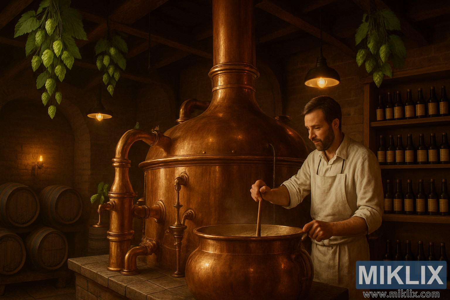 ଏକ ଗ୍ରାମୀଣ ବ୍ରୁହାଉସ୍ ଭିତରର ଏକ ବିସ୍ତୃତ ଦୃଶ୍ୟ ଯେଉଁଥିରେ ଏକ ତମ୍ବା କେତଲି, ପ୍ରାକୃତିକ ହପ୍ ଲତା, କାଠ ବ୍ୟାରେଲ୍ ଏବଂ କାର୍ଯ୍ୟକ୍ଷମ ଏକ କେନ୍ଦ୍ରିତ ବ୍ରୁୟର ଅଛି।