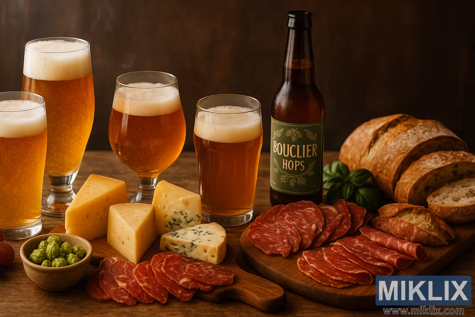 ଏକ ଉଷ୍ମ, ଗ୍ରାମୀଣ ସ୍ଥିର ଜୀବନ ଯାହା ହସ୍ତଶିଳ୍ପ ବିୟର ସହିତ ହସ୍ତଶିଳ୍ପ ପନିର, କ୍ୟୁର୍ଡ ମାଂସ ଏବଂ ତାଜା ରୁଟିକୁ ପ୍ରଦର୍ଶିତ କରେ, ଯାହା ବଉକ୍ଲିଅର୍ ହପ୍ସ ଯୋଡ଼ିକୁ ଉଲ୍ଲେଖ କରେ।