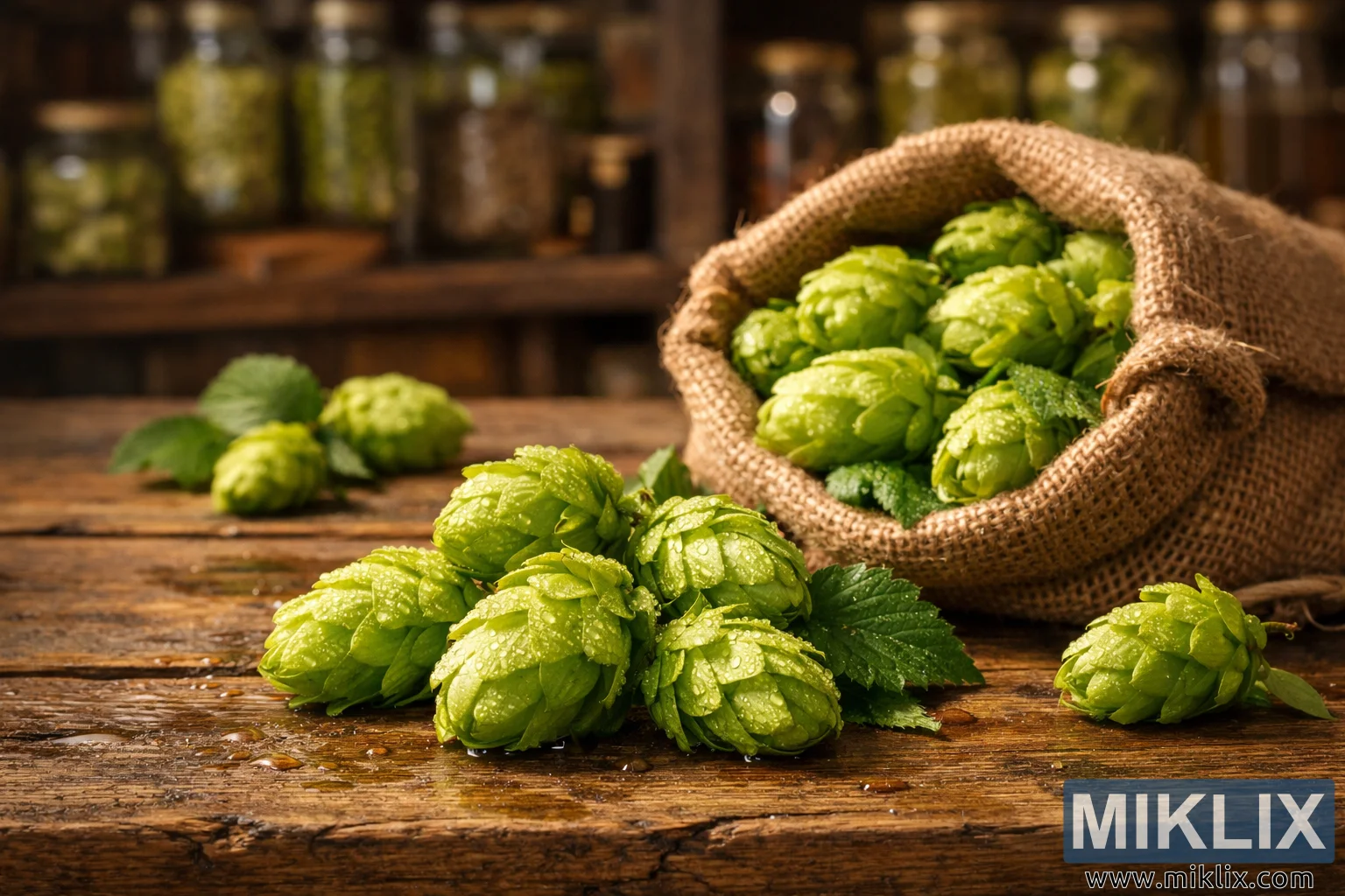 କାଠ ଟେବୁଲ୍ ଉପରେ ତାଜା କ୍ଲଷ୍ଟର ହପ୍ସର ଏକ ଉଷ୍ମ, ଗ୍ରାମାଞ୍ଚଳ ସ୍ଥିର ଜୀବନ, କାକର ଆଚ୍ଛାଦିତ ସବୁଜ କୋନ୍, ହପ୍ସରେ ଭର୍ତ୍ତି ଏକ ବାରଲାପ୍ ବସ୍ତା, ଏବଂ ପୃଷ୍ଠଭୂମିରେ ସାମାନ୍ୟ ଅସ୍ପଷ୍ଟ ମଦ ପ୍ରସ୍ତୁତ ସାମଗ୍ରୀ।
