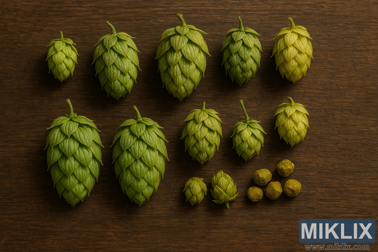 ଏହି ଚିତ୍ରଟି ଏକ ଆକର୍ଷଣୀୟ ଏବଂ ସୂକ୍ଷ୍ମ ସ୍ଥିର ଜୀବନ ବ୍ୟବସ୍ଥା ଉପସ୍ଥାପନ କରେ ଯାହା ହପ୍ ପ୍ରକାର ମଧ୍ୟରେ ବିବିଧତା ଏବଂ ସୂକ୍ଷ୍ମତାକୁ ଉଜ୍ଜ୍ୱଳ କରିବା ପାଇଁ ଡିଜାଇନ୍ କରାଯାଇଛି, ଯେଉଁଥିରେ ୟୁରେକା ହପ୍ସ ଏବଂ ସେମାନଙ୍କର ନିକଟ ସମ୍ପର୍କୀୟମାନଙ୍କ ଉପରେ ବିଶେଷ ଗୁରୁତ୍ୱ ଦିଆଯାଇଛି। ଏକ ସମୃଦ୍ଧ, ଗ୍ରାମୀଣ କାଠ ପୃଷ୍ଠରେ ସୁନ୍ଦର ଭାବରେ ବିସ୍ତାରିତ, କୋନ୍ଗୁଡ଼ିକ ଉଦ୍ଦେଶ୍ୟମୂଳକ ଧାଡିରେ ସଂଗଠିତ ହୋଇଛି, ପ୍ରତ୍ୟେକଟି ଆକାର, ଆକୃତି ଏବଂ ରଙ୍ଗରେ ବିଭିନ୍ନତା ପ୍ରଦର୍ଶନ କରୁଛି। କିଛି ବଡ଼ ଏବଂ ଲମ୍ବା, ସେମାନଙ୍କର ବ୍ର୍ୟାକ୍ଟଗୁଡ଼ିକ କଡ଼ା ଭାବରେ ସ୍ତରୀଭୂତ ସର୍ପଳରେ ଆଚ୍ଛାଦିତ ଯାହା ଉଷ୍ମ, ଦିଗଦର୍ଶନ ଆଲୋକ ତଳେ ସାମାନ୍ୟ ଭାବରେ ଚମକଦାର। ଅନ୍ୟଗୁଡ଼ିକ ଛୋଟ ଏବଂ ଅଧିକ ସଂକୁଚିତ, ସେମାନଙ୍କର ମାପ ଟିକେ ଢିଲା, ସେମାନଙ୍କର ରଙ୍ଗ ସ୍ପନ୍ଦନଶୀଳ ଏମରାଲ୍ଡରୁ ନିଃଶବ୍ଦ ହଳଦିଆ-ସବୁଜକୁ ସ୍ଥାନାନ୍ତରିତ ହେଉଛି, ଯାହା ପରିପକ୍ୱତାର ବିଭିନ୍ନ ପର୍ଯ୍ୟାୟ କିମ୍ବା ସୂକ୍ଷ୍ମ ପ୍ରକାର ପାର୍ଥକ୍ୟ ସୂଚାଇଥାଏ। ଏହି ସତର୍କ ପ୍ରଦର୍ଶନ ଦର୍ଶକଙ୍କୁ କେବଳ କୋନ୍ଗୁଡ଼ିକୁ ଉପାଦାନ ଭାବରେ ନୁହେଁ, ବରଂ ଅନନ୍ୟ ପରିଚୟ ସହିତ ଜୀବନ୍ତ କୃଷି ଉତ୍ପାଦ ଭାବରେ ବିବେଚନା କରିବାକୁ ଅନୁମତି ଦିଏ, ପ୍ରତ୍ୟେକଟି ବାଇନ୍ରୁ ବ୍ରୁହାଉସ୍ ପର୍ଯ୍ୟନ୍ତ ଏକ କାହାଣୀ ବହନ କରେ।