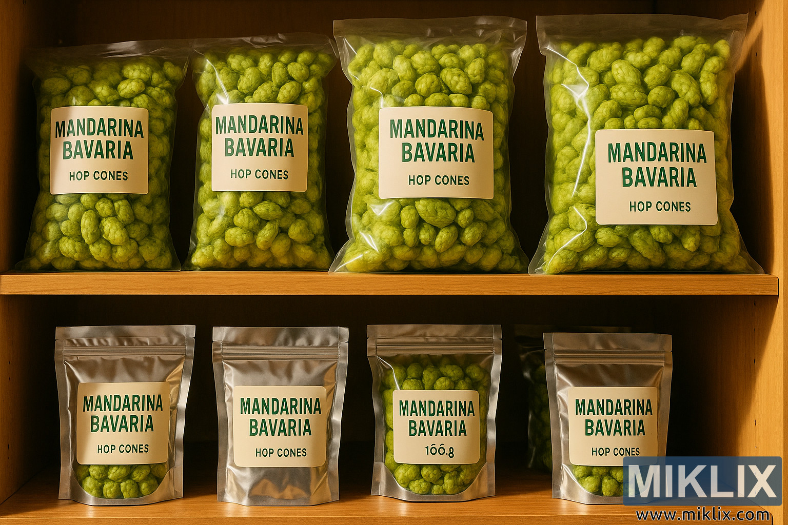 ଉପର ସେଲ୍ଫରେ ବଡ଼, ସ୍ପଷ୍ଟ ପ୍ଲାଷ୍ଟିକ୍ ବ୍ୟାଗଗୁଡ଼ିକ ରହିଛି ଯାହା ପ୍ଲମ୍ପ୍ ହପ୍ କୋନ୍ ସହିତ କଡ଼ାକଡ଼ି ଭାବରେ ପ୍ୟାକ୍ କରାଯାଇଛି। ପ୍ରତ୍ୟେକ ବ୍ୟାଗ ସ୍ୱଚ୍ଛ, ଯାହା ବିଷୟବସ୍ତୁର ଉଜ୍ଜ୍ୱଳ, ତାଜା ସବୁଜ ରଙ୍ଗକୁ ଦୃଶ୍ୟ ଉପରେ ପ୍ରଭାବ ପକାଇଥାଏ। ପ୍ରତ୍ୟେକ ପ୍ୟାକେଜ୍ ସହିତ ଏକ ସଫା, ସର୍ବନିମ୍ନ ଲେବଲ୍ ଲଗାଯାଇଛି ଯାହାର ବୋଲ୍ଡ ସବୁଜ ଅକ୍ଷରରେ "ମାଣ୍ଡାରିନା ବାଭାରିଆ" ଏବଂ "ହପ୍ କୋନ୍" ଲେଖାଯାଇଛି। ଲେବଲଗୁଡ଼ିକର ସମାନତା ଏବଂ ପ୍ୟାକେଜିଂର ସ୍ଥିରତା ବ୍ରାଣ୍ଡ ସଂହତି ଏବଂ ନିର୍ଭରଯୋଗ୍ୟତାର ଭାବନା ସୃଷ୍ଟି କରେ। ଏହି ବ୍ୟାଗଗୁଡ଼ିକରେ ଥିବା ହପ୍ କୋନ୍ ବିଶେଷ ଭାବରେ ପୂର୍ଣ୍ଣ ଏବଂ ଦୃଢ଼ ଦେଖାଯାଏ, ଯାହା ଗୁଣବତ୍ତା ସହିତ ଆପତ୍ତି ନକରି ଅଧିକ ପରିମାଣ ଖୋଜୁଥିବା ବ୍ରୁଅର୍ ପାଇଁ ସେମାନଙ୍କର ଉପଯୁକ୍ତତା ସୂଚାଇଥାଏ।