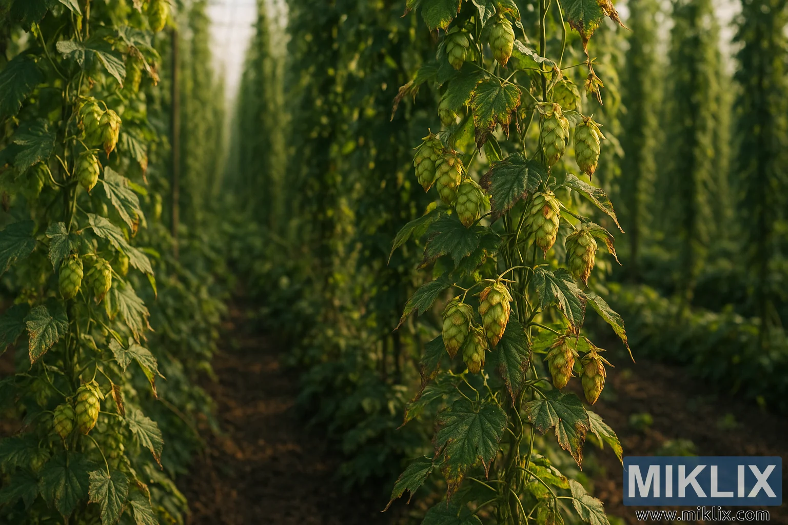 ଏହି ଚିତ୍ରଟି ଏକ ହଜମ କିନ୍ତୁ ଅସୁବିଧାଗ୍ରସ୍ତ ହପ୍ କ୍ଷେତ୍ରକୁ ଦର୍ଶାଉଛି, ଯାହା ଦିଗନ୍ତ ଆଡକୁ ବିସ୍ତାରିତ ମାଣ୍ଡାରିନା ବାଭାରିଆ ହପ୍ ବାଇନ୍ର ଲମ୍ବା ଧାଡିକୁ ଦର୍ଶାଉଛି। ଗଛଗୁଡ଼ିକ ଉଚ୍ଚ ଟ୍ରେଲିସ୍ ରେଖା ସହିତ ବଢ଼ନ୍ତି, ସେମାନଙ୍କର ମୋଡ଼ି ଲତା ଘନ, ପରସ୍ପର ସହିତ ଜଡିତ କ୍ଲଷ୍ଟରରେ ଉପରକୁ ବୁଣାଯାଏ। ସୂର୍ଯ୍ୟକିରଣ ଏକ ନିମ୍ନ କୋଣରେ ପତ୍ର ମାଧ୍ୟମରେ ଛାଣିଥାଏ, ଯାହା ସକାଳ କିମ୍ବା ବିଳମ୍ବିତ ଅପରାହ୍ନକୁ ସୂଚାଇଥାଏ, ଏବଂ ଧାଡି ମଧ୍ୟରେ ସମୃଦ୍ଧ ବାଦାମୀ ମାଟିରେ ନରମ, ଝୁଲୁଛି ଛାୟା ପକାଇଥାଏ। ଯଦିଓ ସାମଗ୍ରିକ ଦୃଶ୍ୟ ପ୍ରଥମ ନଜରରେ ସ୍ପନ୍ଦନଶୀଳ ଏବଂ ସୁସ୍ଥ ଦେଖାଯାଏ, ନିକଟତର ଦୃଷ୍ଟିକୋଣରୁ ବୃଦ୍ଧି ପାଉଥିବା ସଙ୍କଟର ଲକ୍ଷଣ ପ୍ରକାଶ କରେ ଯାହା ଫସଲକୁ ପ୍ରଭାବିତ କରୁଥିବା ଏକ ଗଭୀର ସମସ୍ୟାକୁ ସଙ୍କେତ ଦିଏ।
