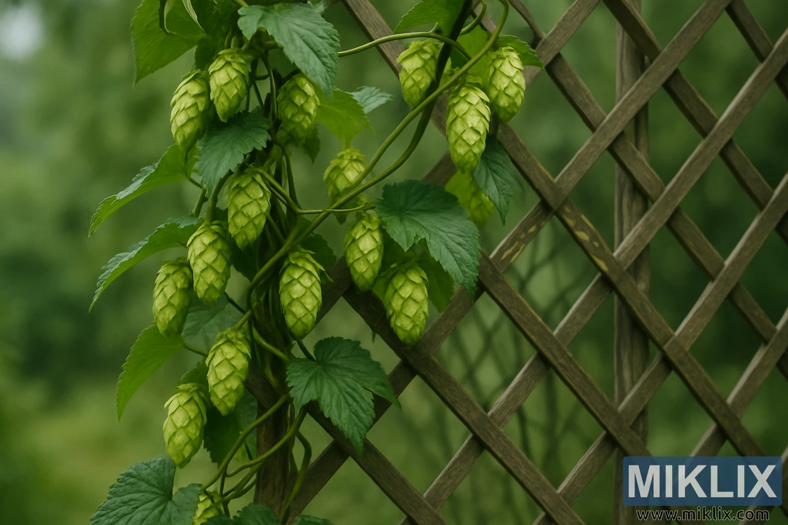 ଏକ ସବୁଜ ରଙ୍ଗର ହପ୍ ବାଇନ୍ ଯାହା ପତ୍ର ଏବଂ ପରିପକ୍ୱ କୋଣ ସହିତ ଏକ ପାଚିଲା ଟ୍ରେଲିସ୍ ଦେଇ ବୁଣାଯାଇଛି, ଏକ ଶାନ୍ତ ଅସ୍ପଷ୍ଟ ପୃଷ୍ଠଭୂମି ସହିତ ବିସ୍ତାରିତ ପ୍ରାକୃତିକ ଆଲୋକରେ କଏଦ ହୋଇଛି।