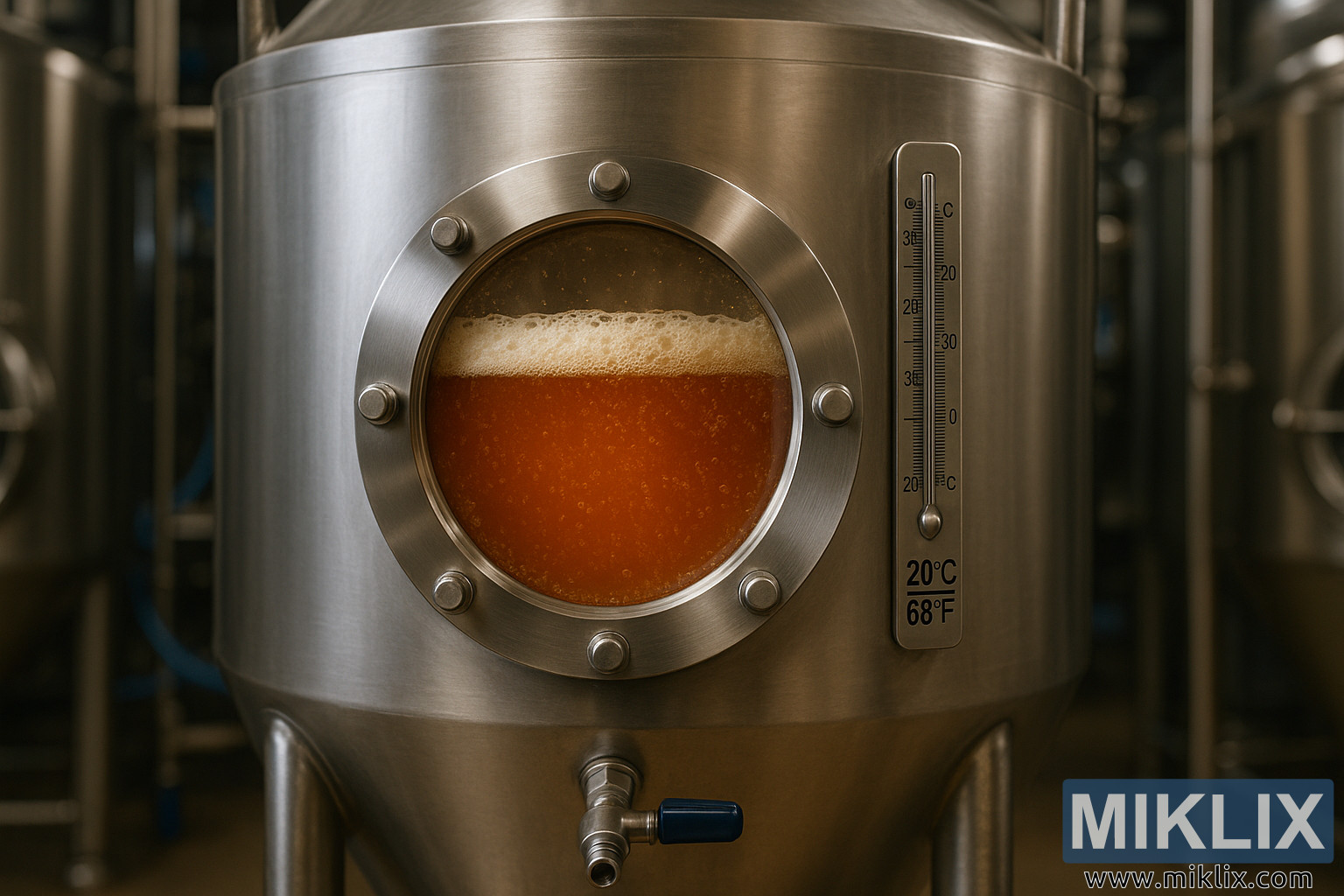 ଏକ ବାଣିଜ୍ୟିକ ଷ୍ଟେନଲେସ୍ ଷ୍ଟିଲ୍ ଫର୍ମେଣ୍ଟରର ଉଚ୍ଚ-ରିଜୋଲ୍ୟୁସନ୍ ଫଟୋ ଯାହା ଭିତରେ ଆମ୍ବର ଆଲ୍ ଫର୍ମେଣ୍ଟ ହେଉଛି, ଏକ ସାଇଟ୍ ଗ୍ଲାସ୍ ମାଧ୍ୟମରେ ଦେଖାଯାଉଛି, ଥର୍ମୋମିଟର 20°C (68°F) ରେ ଅଛି।