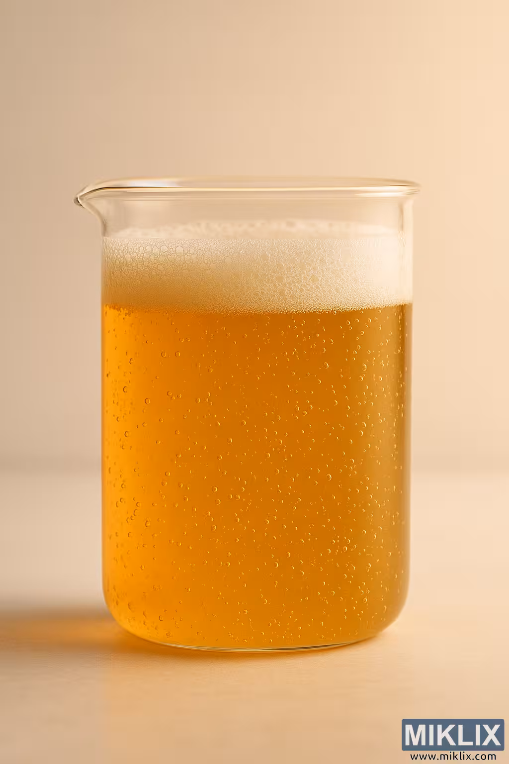 ଏହି ଚିତ୍ରଟି ଏକ ସ୍ୱର୍ଣ୍ଣ, ସକ୍ରିୟ ଭାବରେ କିଣ୍ଷଣକାରୀ ତରଳ ପଦାର୍ଥରେ ପରିପୂର୍ଣ୍ଣ ଏକ ସ୍ୱଚ୍ଛ ପରୀକ୍ଷାଗାର ବିକରର ଏକ ସତର୍କତାର ସହିତ ସଂଗଠିତ ନିକଟତର ଦୃଶ୍ୟକୁ କଏଦ କରେ। ବିକରଟି ଅଗ୍ରଭାଗରେ ପ୍ରମୁଖ ଭାବରେ ଠିଆ ହୋଇଛି, ଏକ ସଫା, ମୃଦୁ ଅସ୍ପଷ୍ଟ ପୃଷ୍ଠଭୂମି ବିରୁଦ୍ଧରେ ପୃଥକ ଭାବରେ ଯାହା ଉଷ୍ମ ବେଜ୍ ଏବଂ କ୍ରିମ୍ ଟୋନ୍ ମିଶ୍ରଣ କରେ। କାଚ ପୃଷ୍ଠରେ ମାପ ଚିହ୍ନ କିମ୍ବା ପାଠ୍ୟର ଅନୁପସ୍ଥିତି ଏକ ସର୍ବନିମ୍ନ ସୌନ୍ଦର୍ଯ୍ୟ ସୃଷ୍ଟି କରେ, ଯାହା ରୂପ ଏବଂ ବିଷୟବସ୍ତୁର ଶୁଦ୍ଧତା ଉପରେ ଗୁରୁତ୍ୱାରୋପ କରେ। ଏହି ଅବ୍ୟବସ୍ଥିତ ଉପସ୍ଥାପନା ଦର୍ଶକଙ୍କୁ ସମ୍ପୂର୍ଣ୍ଣ ଭାବରେ ତରଳ ପଦାର୍ଥର ଗତିଶୀଳ ଗୁଣବତ୍ତା ଉପରେ ଧ୍ୟାନ ଦେବାକୁ ଅନୁମତି ଦିଏ।