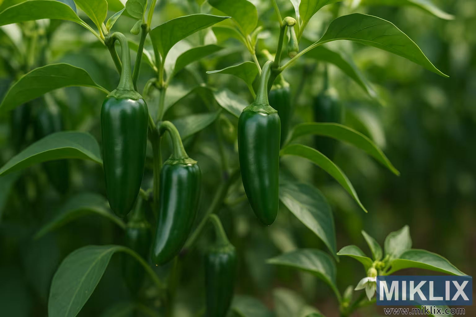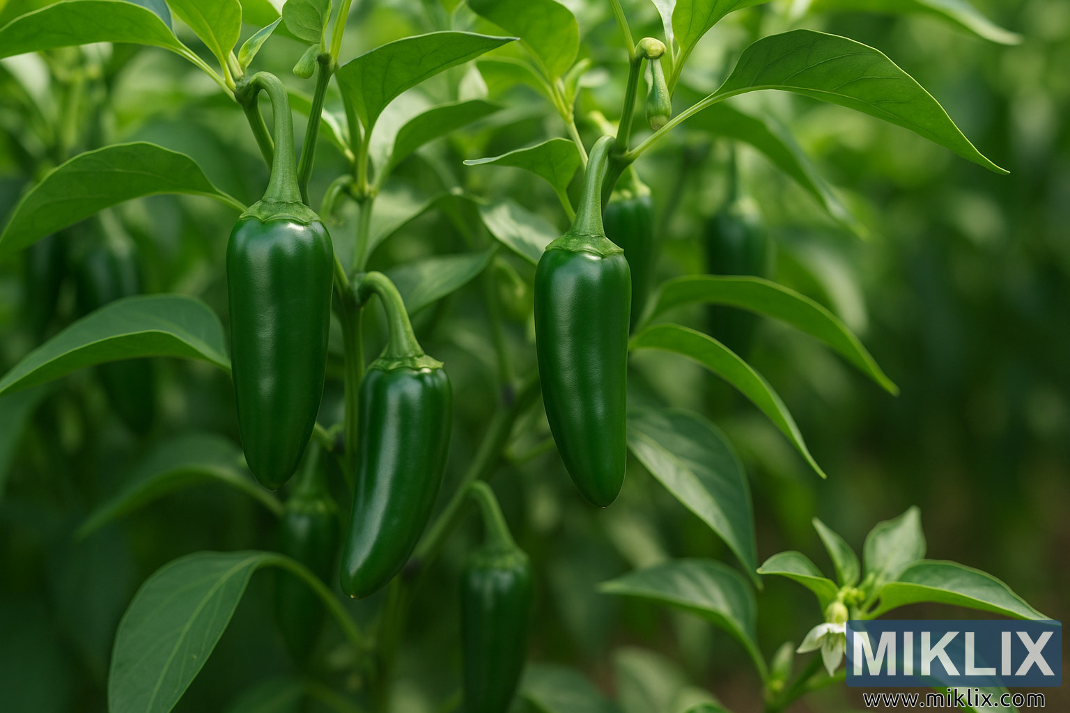ଏକ ସୁସ୍ଥ ଗଛରେ ବଢ଼ୁଥିବା ଜାଲାପେନୋ ଲଙ୍କାର ଏକ ବିସ୍ତୃତ ନିକଟତମ ଦୃଶ୍ୟ, ଯାହା ସ୍ପନ୍ଦନଶୀଳ ସବୁଜ ଫଳ ଏବଂ ପତ୍ରକୁ ପ୍ରଦର୍ଶନ କରୁଛି।