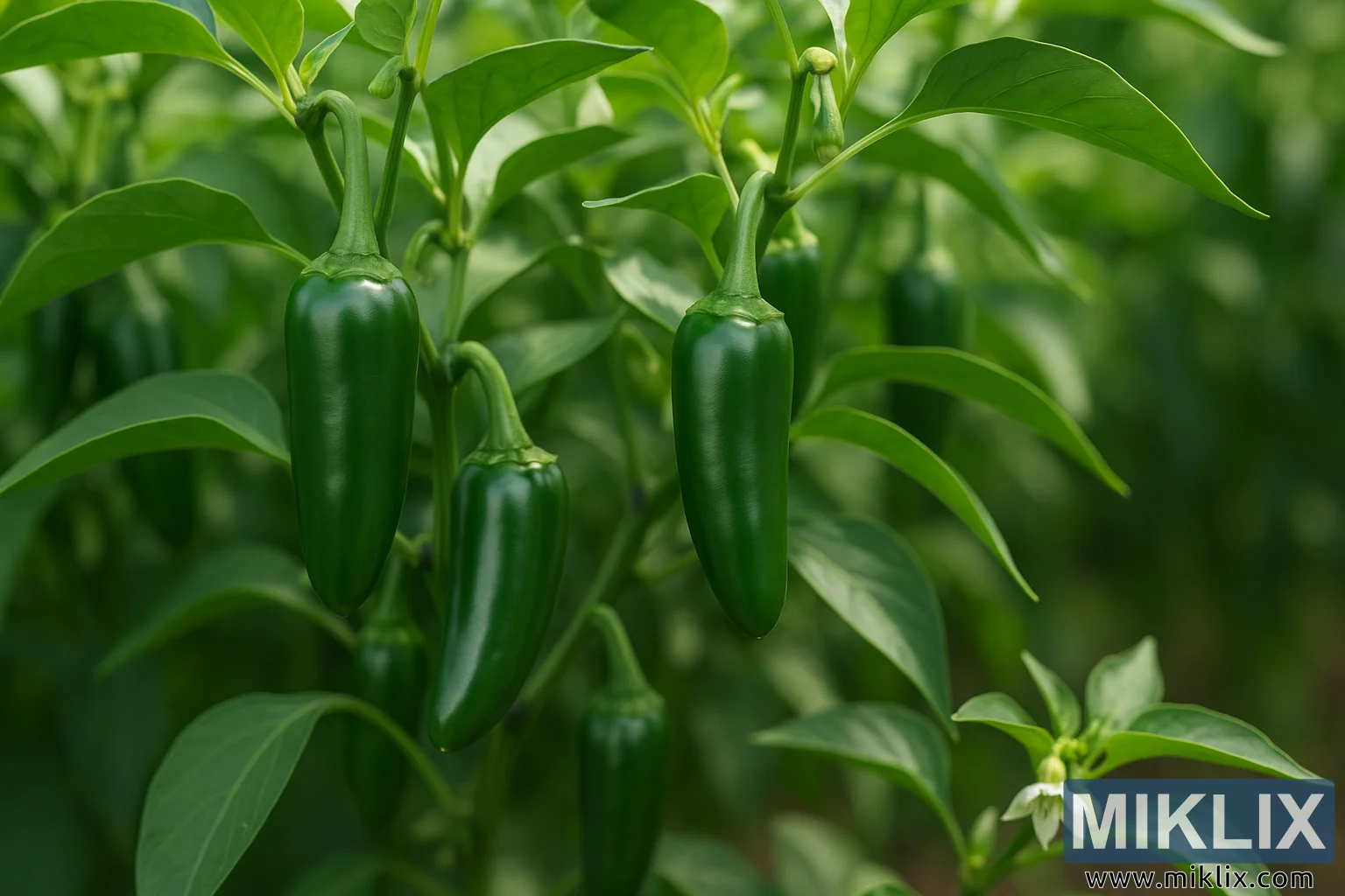 ପ୍ରାକୃତିକ ସୂର୍ଯ୍ୟାଲୋକ ସମଗ୍ର ଦୃଶ୍ୟକୁ ସ୍ନାନ କରେ, ଜାଲାପେନୋରେ ନରମ ହାଇଲାଇଟ୍ସ ସୃଷ୍ଟି କରେ ଏବଂ ପତ୍ର ତଳେ ହାଲୁକା ଛାଇ ପକାଏ। ଆଲୋକ ଅବସ୍ଥା ଏକ ଉଷ୍ମ, ସମୃଦ୍ଧ ଉଦ୍ୟାନ ପରିବେଶର ଏକ ଛାପ ପ୍ରଦାନ କରେ - ସମ୍ଭବତଃ ଏକ ପଛପଟ ପ୍ଲଟ୍ କିମ୍ବା ଛୋଟ-ସ୍କେଲ ଫାର୍ମ। ଅଗ୍ରଭାଗରେ ତୀକ୍ଷ୍ଣ ବିବରଣୀର ସନ୍ତୁଳନ ଏବଂ ପୃଷ୍ଠଭୂମିରେ ମୃଦୁ ବ୍ଲରିଂ ପ୍ରତିଛବିକୁ ଏକ ବୃତ୍ତିଗତ, ପ୍ରାୟ ଫଟୋଗ୍ରାଫିକ୍ ଗୁଣବତ୍ତା ପ୍ରଦାନ କରେ ଯାହା ଉଦ୍ଭିଦର ସୌନ୍ଦର୍ଯ୍ୟ ଏବଂ ଜୀବନଶକ୍ତି ଉପରେ ଗୁରୁତ୍ୱାରୋପ କରେ।