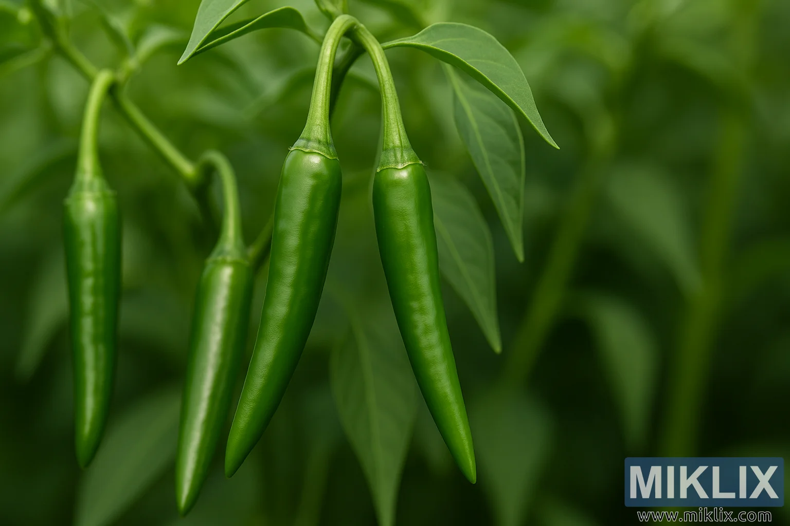 ଏହି ଚିତ୍ରଟି ଗଛ ଉପରେ ସିଧାସଳଖ ବଢ଼ୁଥିବା ଅନେକ ସେରାନୋ ଲଙ୍କାର ଏକ ସ୍ପଷ୍ଟ, ନିକଟତର ଦୃଶ୍ୟ ଦେଖାଉଛି, ଯାହା ଏକ ସୁନ୍ଦର ଏବଂ ଉର୍ବର ଉଦ୍ୟାନ ପରିବେଶରେ କଏଦ ହୋଇଛି। ଲଙ୍କାଗୁଡ଼ିକ ପତଳା ଡାଳରୁ ସୁନ୍ଦର ଭାବରେ ଝୁଲି ରହିଛି, ସେମାନଙ୍କର ଲମ୍ବା ରୂପଗୁଡ଼ିକ ସୂକ୍ଷ୍ମ ବିନ୍ଦୁରେ ସଙ୍କୁଚିତ ହୋଇଛି ଯାହା ସେରାନୋ କିସମର ସ୍ୱତନ୍ତ୍ର ସଂକୀର୍ଣ୍ଣ ଏବଂ ସାମାନ୍ୟ ବଙ୍କା ସିଲୁଏଟ୍ ବୈଶିଷ୍ଟ୍ୟକୁ ଉଜ୍ଜ୍ୱଳ କରିଥାଏ। ପ୍ରତ୍ୟେକ ଲଙ୍କା ଏକ ମସୃଣ, ଚମକଦାର ସବୁଜ ପୃଷ୍ଠ ପ୍ରଦର୍ଶନ କରେ ଯାହା ନରମ, ପ୍ରାକୃତିକ ଆଲୋକକୁ ପ୍ରତିଫଳିତ କରେ, ସେମାନଙ୍କର ଚର୍ମ ସହିତ ସ୍ୱର ଏବଂ ଗଠନରେ ସୂକ୍ଷ୍ମ ପରିବର୍ତ୍ତନକୁ ଗୁରୁତ୍ୱ ଦିଏ। ଲଙ୍କାଗୁଡ଼ିକ ସୁସ୍ଥ ଏବଂ ଦୃଢ଼ ଦେଖାଯାଏ, ଯାହା ସର୍ବୋତ୍ତମ ବୃଦ୍ଧି ପରିସ୍ଥିତି ସୂଚାଇଥାଏ।