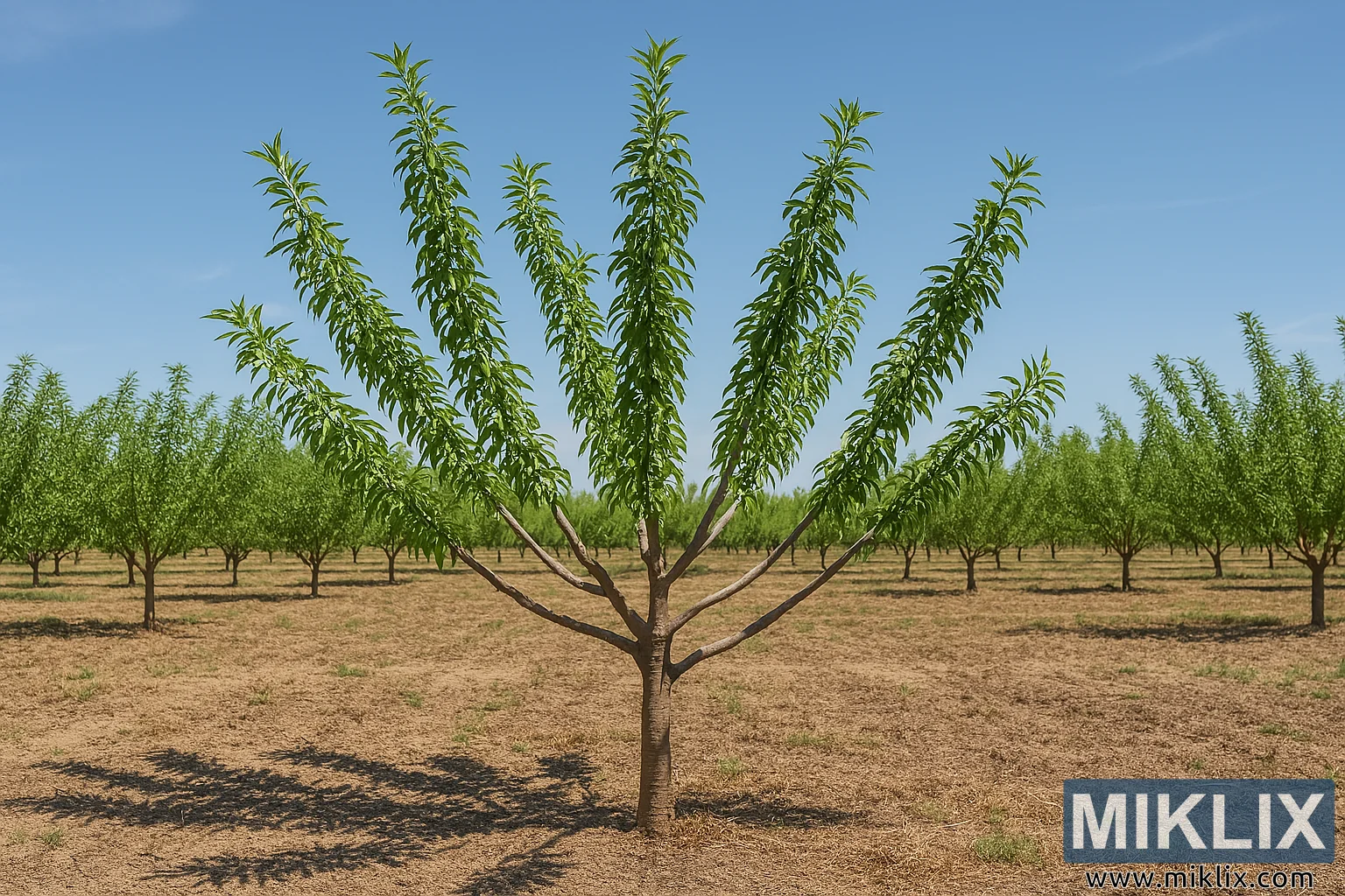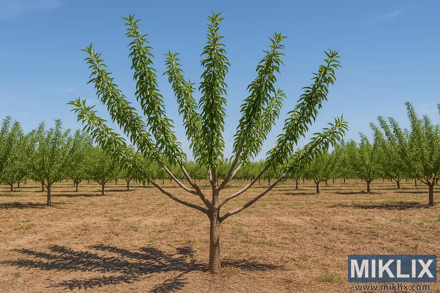 ଆଦର୍ଶ ଭାରା ଶାଖା ଗଠନ ସହିତ ଏକ ଯୁବ ବାଦାମ ଗଛର ଉଚ୍ଚ-ରିଜୋଲ୍ୟୁସନ୍ ଚିତ୍ର, ଯାହା ଉଦ୍ୟାନ ତାଲିମ ଏବଂ ଉଦ୍ୟାନ କୃଷି ସନ୍ଦର୍ଭ ପାଇଁ ଉପଯୁକ୍ତ।