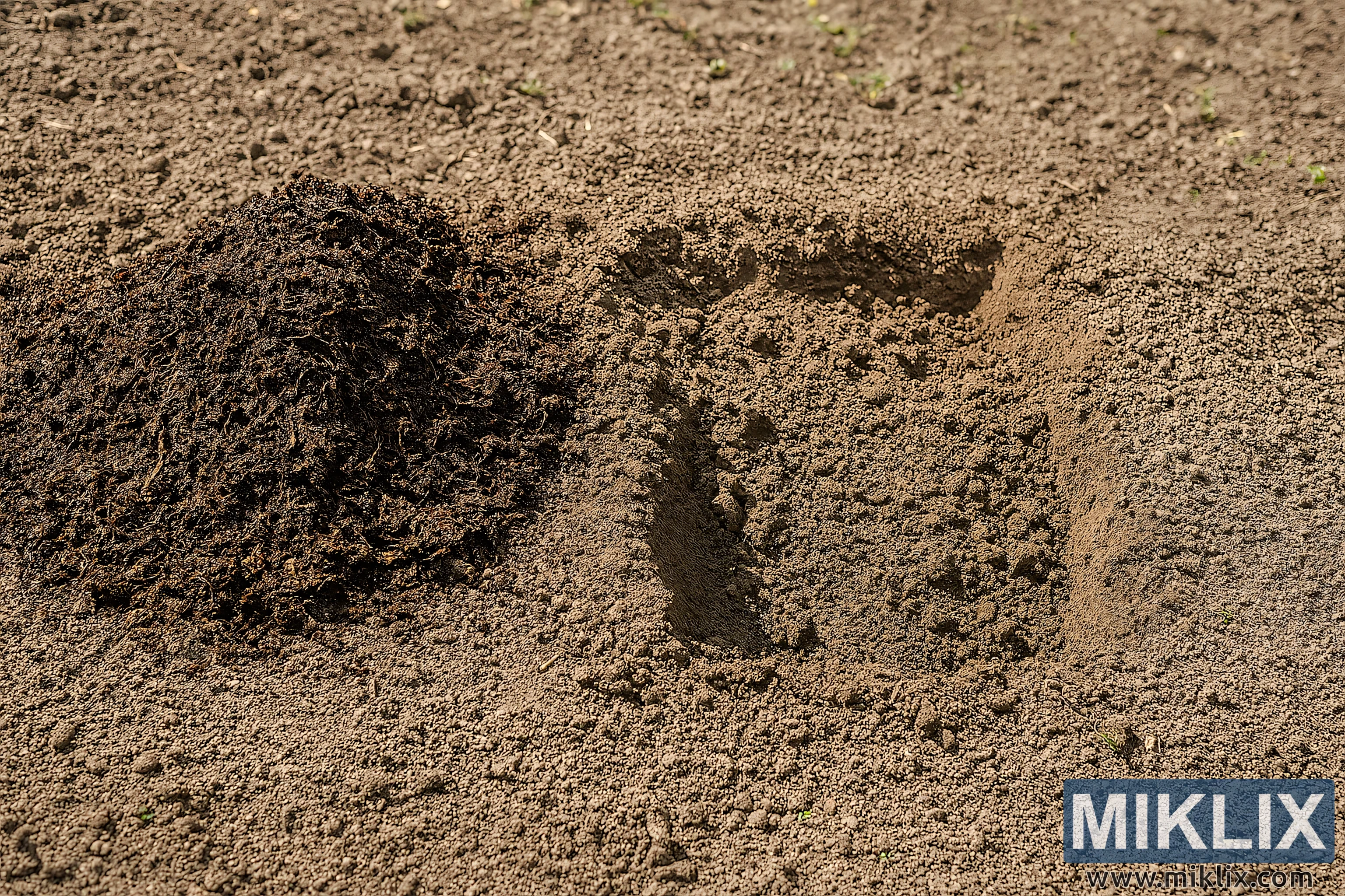 କମ୍ପୋଷ୍ଟ ଏବଂ ଗାତ ଚାରିପାଖରେ ଉଦ୍ୟାନ ମାଟିର ଏକ ବିସ୍ତୃତ ବିସ୍ତାର ଅଛି ଯାହା ପୃଷ୍ଠଭୂମିକୁ ବ୍ୟାପି ରହିଛି। ଏହି ମାଟି ସମାନ ଭାବରେ ଗଠନଯୁକ୍ତ, ଏକ ସୂକ୍ଷ୍ମ, ଖଣ୍ଡ ଖଣ୍ଡ ସ୍ଥିରତା ଏବଂ ବିକ୍ଷିପ୍ତ ଛୋଟ ଗଣ୍ଠି ସହିତ। ମାଟିରୁ ବିକ୍ଷିପ୍ତ ସବୁଜ ଗଜା ଏବଂ ପତଳା ଉଦ୍ଭିଦ ଡାଳ ବାହାରିଥାଏ, ଯାହା ବସନ୍ତ ପ୍ରାରମ୍ଭିକ ବୃଦ୍ଧି କିମ୍ବା ସଦ୍ୟ ଚାଷ କରାଯାଇଥିବା ଶଯ୍ୟାକୁ ସୂଚିତ କରେ।