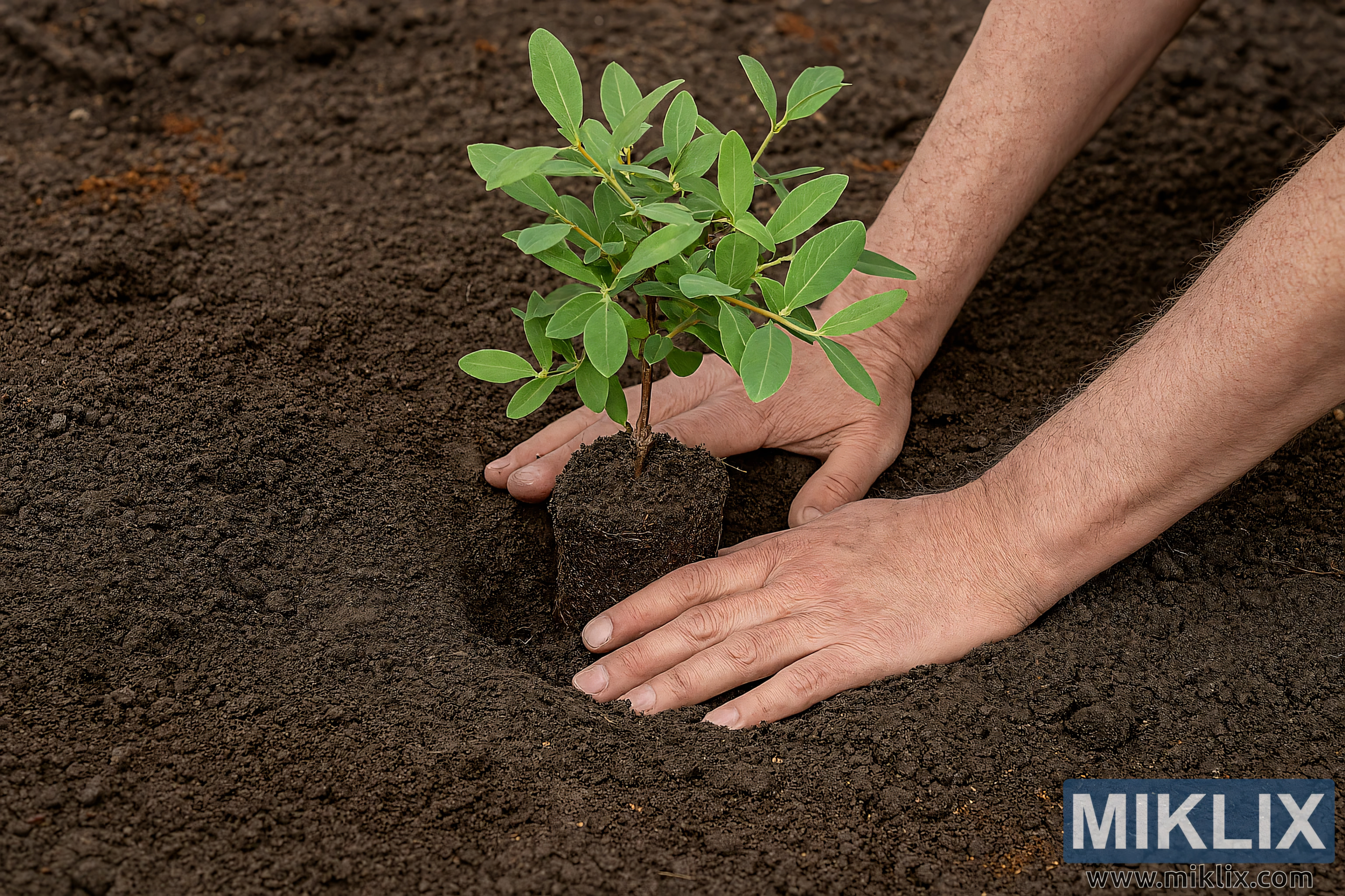 Hands Planting a Honeyberry Bush in Prepared Soil