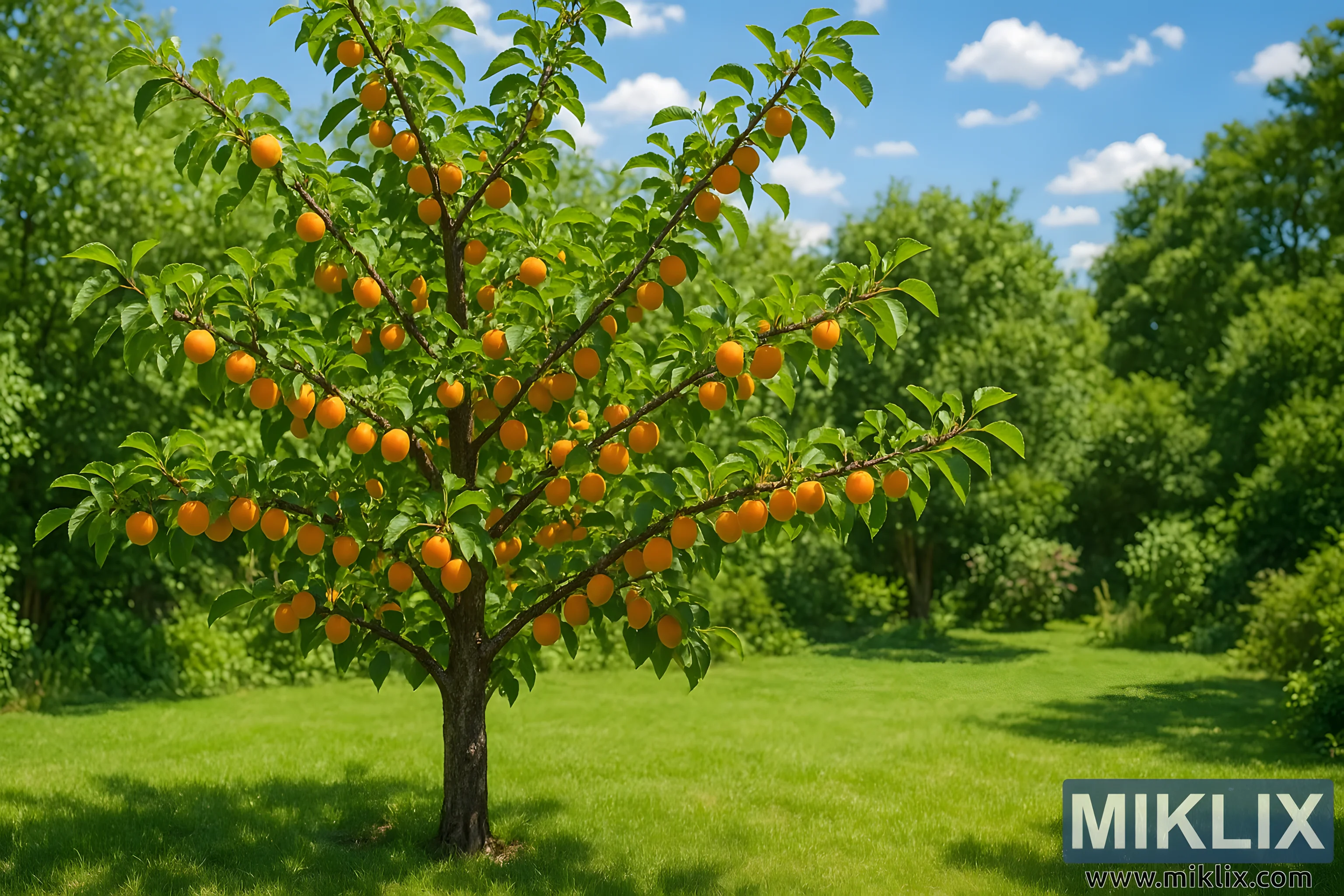 ଏକ ସୂର୍ଯ୍ୟାଲୋକିତ ଗ୍ରୀଷ୍ମକାଳୀନ ଉଦ୍ୟାନ ଯେଉଁଥିରେ ସ୍ୱର୍ଣ୍ଣିମ-କମଳା ଫଳ ସହିତ ପରିପୂର୍ଣ୍ଣ ଏକ ପରିପକ୍ୱ ଆପ୍ରିକଟ୍ ଗଛ ଅଛି, ଯାହା ଏକ ସ୍ୱଚ୍ଛ ନୀଳ ଆକାଶ ତଳେ ଜୀବନ୍ତ ଘାସ ଏବଂ ସବୁଜ ସବୁଜ ଘେରି ରହିଛି।