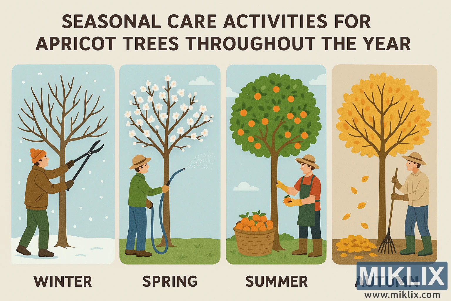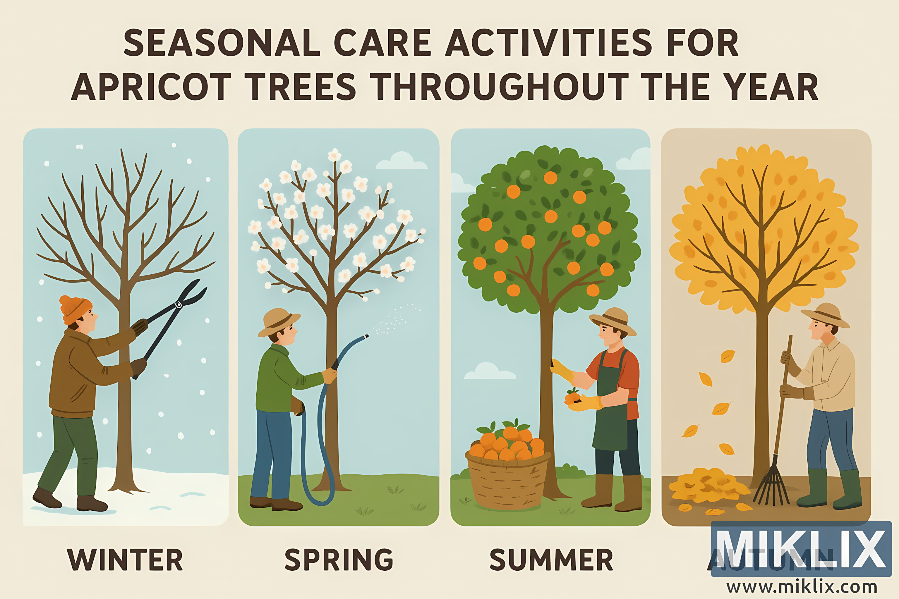 ପ୍ରତ୍ୟେକ ଋତୁରେ ଆପ୍ରିକଟ୍ ଗଛର ଯତ୍ନ କିପରି ନିଆଯିବ ତାହା ଦର୍ଶାଉଥିବା ଏକ ବିସ୍ତୃତ ଚିତ୍ରିତ ମାର୍ଗଦର୍ଶିକା - ଶୀତକାଳୀନ କାଟଛାଣ୍ଟ, ବସନ୍ତ ଋତୁରେ ପାଣି ଦେବା, ଗ୍ରୀଷ୍ମ ଅମଳ ଏବଂ ଶରତ ଋତୁରେ ସଫା କରିବା। ମାଳି ଏବଂ ଉଦ୍ୟାନ ଉତ୍ସାହୀମାନଙ୍କ ପାଇଁ ଉପଯୁକ୍ତ।