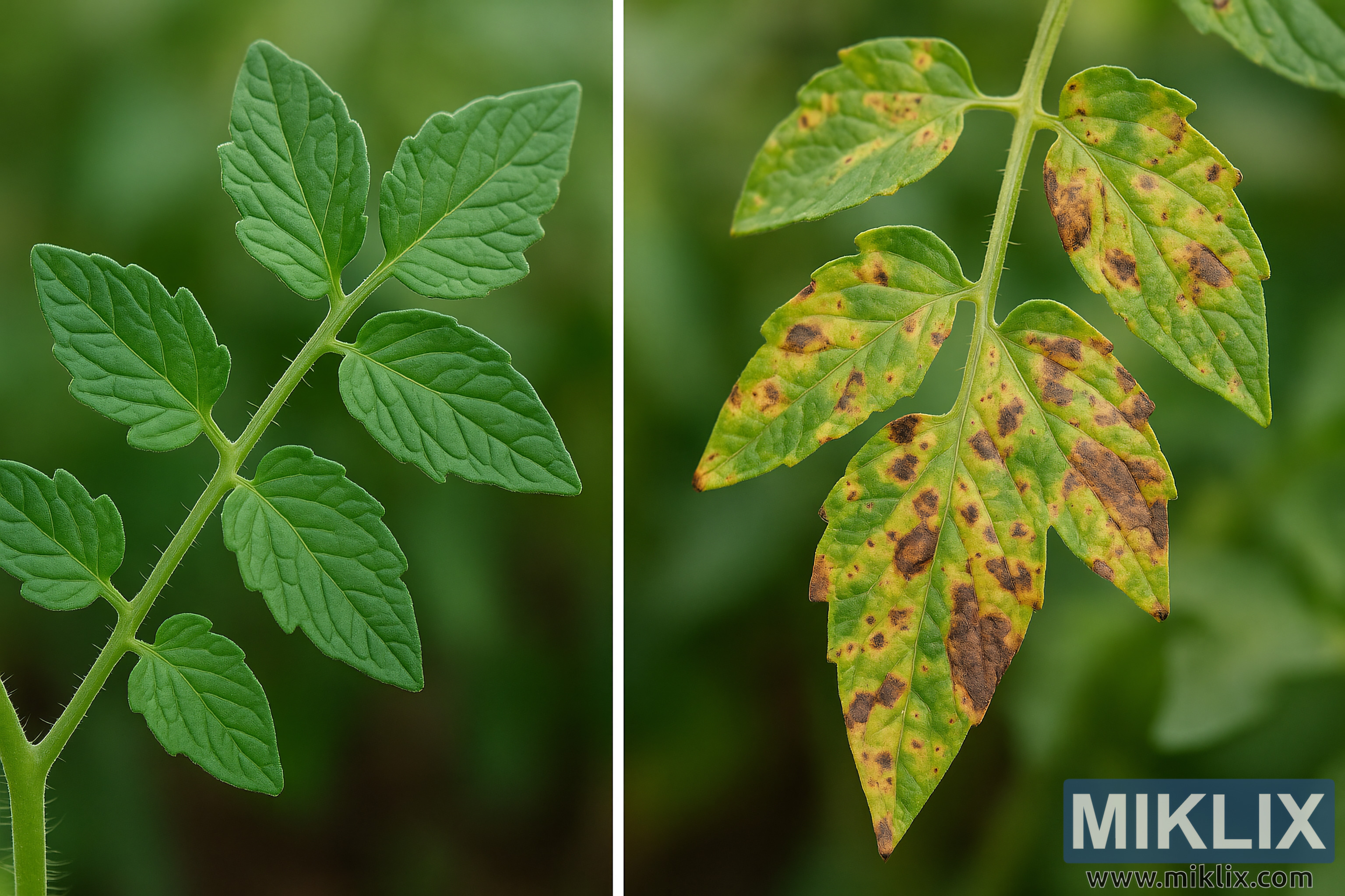 ରୋଗଗ୍ରସ୍ତ ପତ୍ର ପାଖରେ ସୁସ୍ଥ ଟମାଟୋ ପତ୍ର ଦେଖାଯାଉଥିବା ଏକ ବିସ୍ତୃତ ତୁଳନାତ୍ମକ ଚିତ୍ର ଯାହା ଦାଗ ଏବଂ ବିବର୍ଣ୍ଣତା ସହିତ ଦେଖାଯାଉଛି, ଯାହା ଉଦ୍ଭିଦ ସ୍ୱାସ୍ଥ୍ୟ ସମସ୍ୟା ଚିହ୍ନଟ କରିବା ପାଇଁ ଉପଯୋଗୀ।