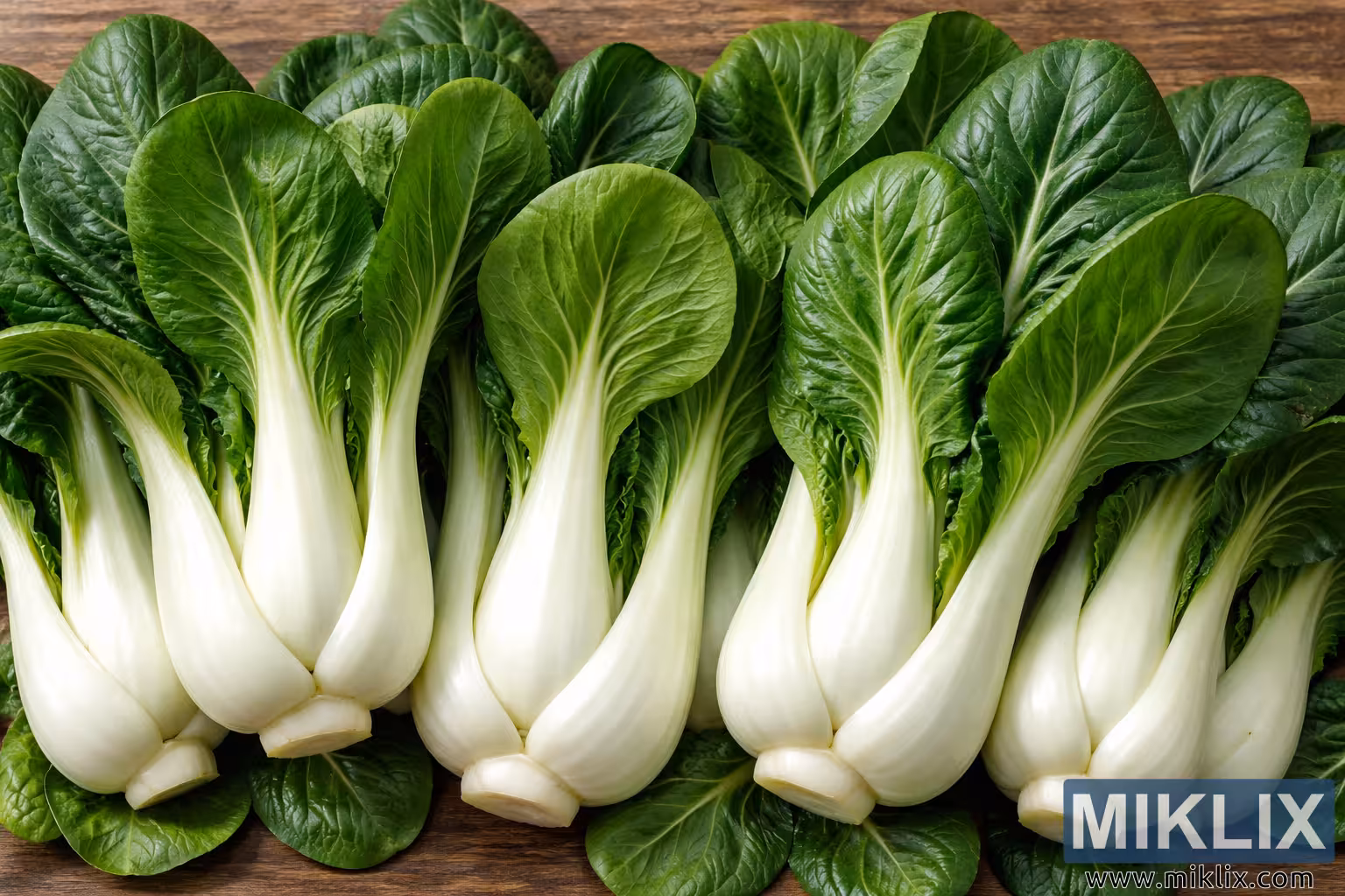 ਬੋਕ ਚੋਏ ਨੂੰ ਮਜ਼ਬੂਤੀ ਨਾਲ ਸਮੂਹਬੱਧ ਕੀਤਾ ਗਿਆ ਹੈ, ਫਰੇਮ ਨੂੰ ਖਿਤਿਜੀ ਤੌਰ 'ਤੇ ਭਰਦੇ ਹਨ ਅਤੇ ਚਿੱਟੇ ਤਣਿਆਂ ਅਤੇ ਹਰੇ ਪੱਤਿਆਂ ਦਾ ਦੁਹਰਾਉਣ ਵਾਲਾ ਪੈਟਰਨ ਬਣਾਉਂਦੇ ਹਨ। ਇਹ ਪ੍ਰਬੰਧ ਭਰਪੂਰਤਾ ਅਤੇ ਇਕਸਾਰਤਾ ਦੀ ਭਾਵਨਾ ਨੂੰ ਮਜ਼ਬੂਤ ਕਰਦਾ ਹੈ, ਕਿਉਂਕਿ ਹਰੇਕ ਪੌਦਾ ਇੱਕੋ ਜਿਹਾ ਪਰਿਪੱਕ ਅਤੇ ਸਿਹਤਮੰਦ ਦਿਖਾਈ ਦਿੰਦਾ ਹੈ। ਉਨ੍ਹਾਂ ਦੇ ਹੇਠਾਂ ਲੱਕੜ ਦੀ ਪਿੱਠਭੂਮੀ ਗਰਮ-ਟੋਨ ਅਤੇ ਬਣਤਰ ਵਾਲੀ ਹੈ, ਦਿਖਾਈ ਦੇਣ ਵਾਲੀਆਂ ਅਨਾਜ ਲਾਈਨਾਂ ਅਤੇ ਸੂਖਮ ਕਮੀਆਂ ਦੇ ਨਾਲ ਜੋ ਇੱਕ ਕੁਦਰਤੀ, ਪੇਂਡੂ ਅਹਿਸਾਸ ਜੋੜਦੀਆਂ ਹਨ। ਲੱਕੜ ਸਬਜ਼ੀਆਂ ਦੇ ਠੰਢੇ ਹਰੇ ਅਤੇ ਚਿੱਟੇ ਰੰਗਾਂ ਨਾਲ ਹੌਲੀ-ਹੌਲੀ ਵਿਪਰੀਤ ਹੈ ਬਿਨਾਂ ਉਨ੍ਹਾਂ ਤੋਂ ਧਿਆਨ ਹਟਾਏ।