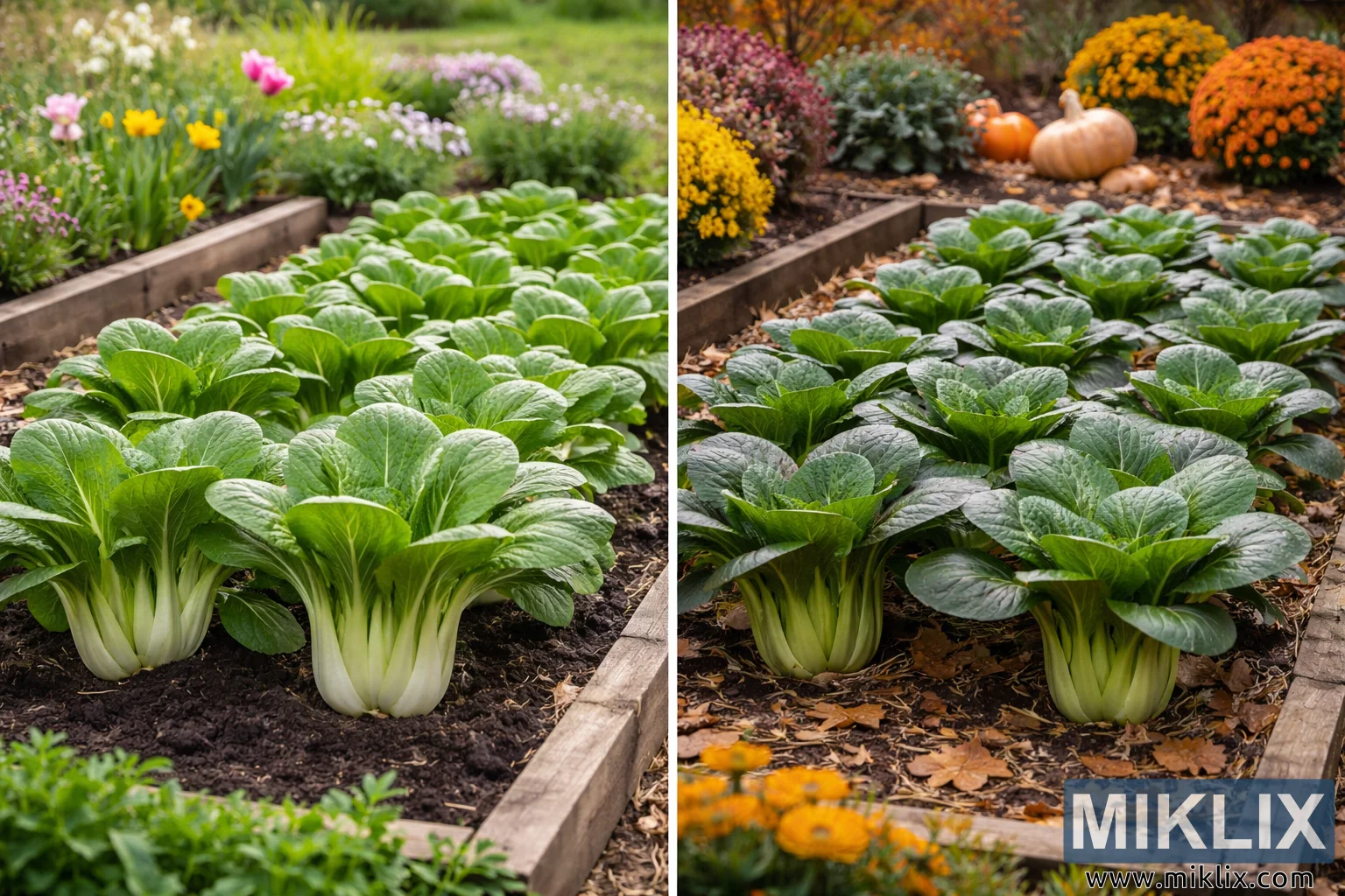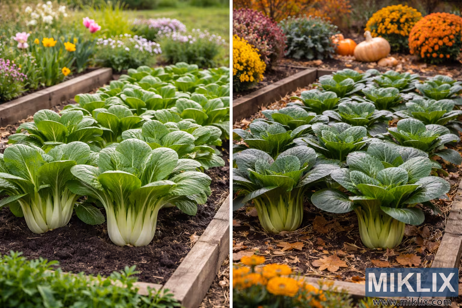 ਉੱਚ-ਰੈਜ਼ੋਲਿਊਸ਼ਨ ਵਾਲੀ ਲੈਂਡਸਕੇਪ ਤਸਵੀਰ ਜਿਸ ਵਿੱਚ ਬੋਕ ਚੋਏ ਨੂੰ ਬਸੰਤ ਅਤੇ ਪਤਝੜ ਦੋਵਾਂ ਦੇ ਬਾਗਾਂ ਵਿੱਚ ਸਫਲਤਾਪੂਰਵਕ ਵਧਦੇ ਦਿਖਾਇਆ ਗਿਆ ਹੈ, ਜੋ ਘਰੇਲੂ ਬਗੀਚੇ ਵਿੱਚ ਮੌਸਮੀ ਪੌਦੇ ਲਗਾਉਣ ਦੇ ਅੰਤਰ ਨੂੰ ਦਰਸਾਉਂਦਾ ਹੈ।