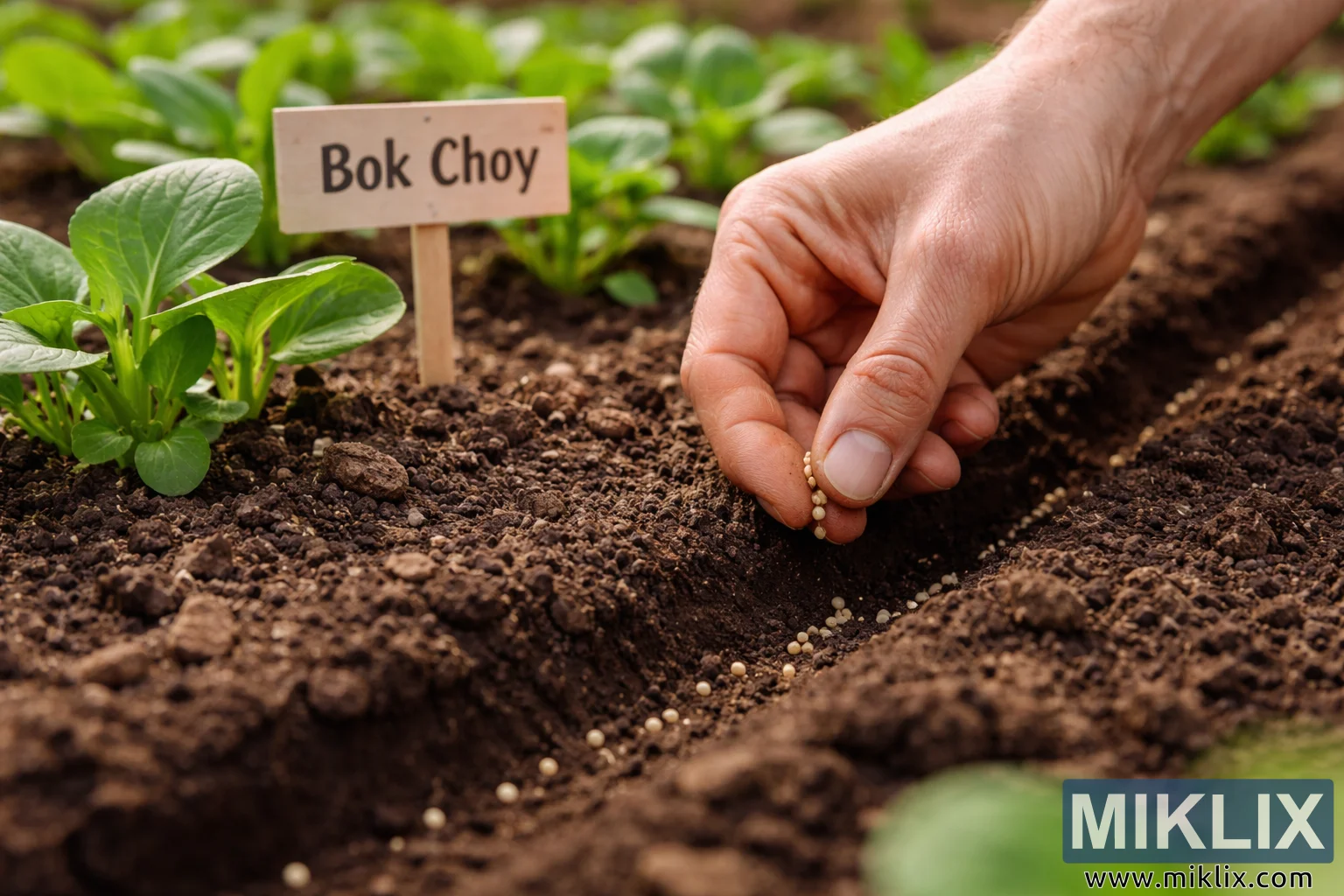 Hand Sowing Bok Choy Seeds in Garden Soil