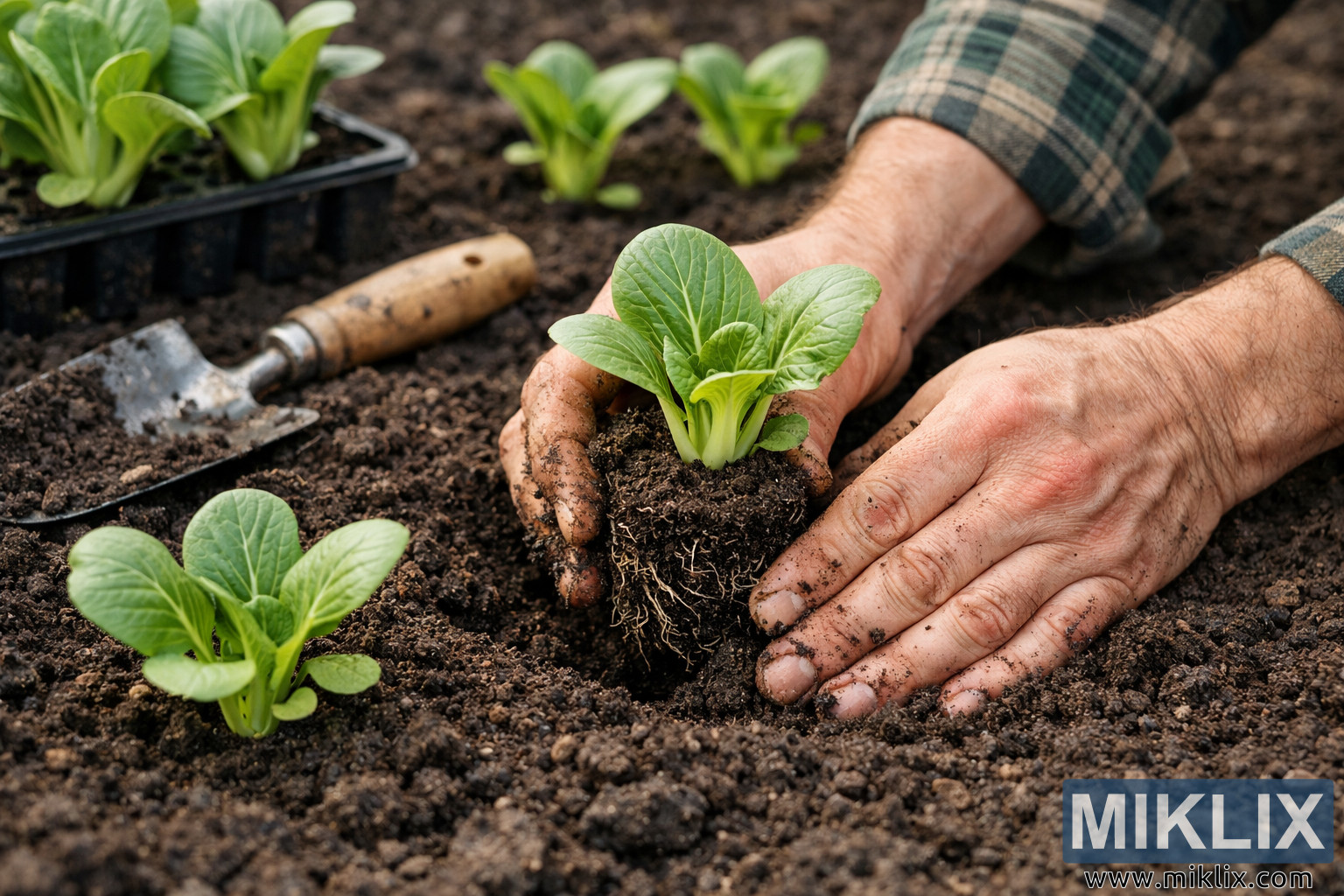 ਪਿਛੋਕੜ ਵਿੱਚ, ਹੌਲੀ-ਹੌਲੀ ਧਿਆਨ ਤੋਂ ਬਾਹਰ, ਵਾਧੂ ਬੋਕ ਚੋਏ ਦੇ ਬੂਟੇ ਪਹਿਲਾਂ ਹੀ ਸਾਫ਼-ਸੁਥਰੀਆਂ ਕਤਾਰਾਂ ਵਿੱਚ ਲਗਾਏ ਗਏ ਹਨ, ਜੋ ਕਿ ਇੱਕ ਕ੍ਰਮਬੱਧ ਸਬਜ਼ੀਆਂ ਦੇ ਬਿਸਤਰੇ ਅਤੇ ਚੱਲ ਰਹੇ ਪੌਦੇ ਲਗਾਉਣ ਦੇ ਕੰਮ ਦਾ ਸੁਝਾਅ ਦਿੰਦੇ ਹਨ। ਲੱਕੜ ਦੇ ਹੈਂਡਲ ਵਾਲਾ ਇੱਕ ਛੋਟਾ ਜਿਹਾ ਹੱਥ ਵਾਲਾ ਟਰੋਵਲ ਚਿੱਤਰ ਦੇ ਖੱਬੇ ਪਾਸੇ ਮਿੱਟੀ 'ਤੇ ਟਿਕਿਆ ਹੋਇਆ ਹੈ, ਜੋ ਅੰਸ਼ਕ ਤੌਰ 'ਤੇ ਧੁੰਦਲਾ ਹੈ ਪਰ ਫਿਰ ਵੀ ਇੱਕ ਆਮ ਬਾਗਬਾਨੀ ਸੰਦ ਵਜੋਂ ਪਛਾਣਿਆ ਜਾ ਸਕਦਾ ਹੈ। ਇੱਕ ਕਾਲੀ ਪਲਾਸਟਿਕ ਦੀ ਬੀਜ ਟ੍ਰੇ ਜਿਸ ਵਿੱਚ ਹੋਰ ਨੌਜਵਾਨ ਪੌਦੇ ਹਨ, ਵੀ ਦਿਖਾਈ ਦੇ ਰਹੀ ਹੈ, ਇਸ ਵਿਚਾਰ ਨੂੰ ਮਜ਼ਬੂਤੀ ਦਿੰਦੀ ਹੈ ਕਿ ਇਹ ਇੱਕ ਸਿੰਗਲ, ਅਲੱਗ-ਥਲੱਗ ਕਾਰਵਾਈ ਦੀ ਬਜਾਏ ਇੱਕ ਵੱਡੀ ਟ੍ਰਾਂਸਪਲਾਂਟਿੰਗ ਪ੍ਰਕਿਰਿਆ ਦਾ ਹਿੱਸਾ ਹੈ।