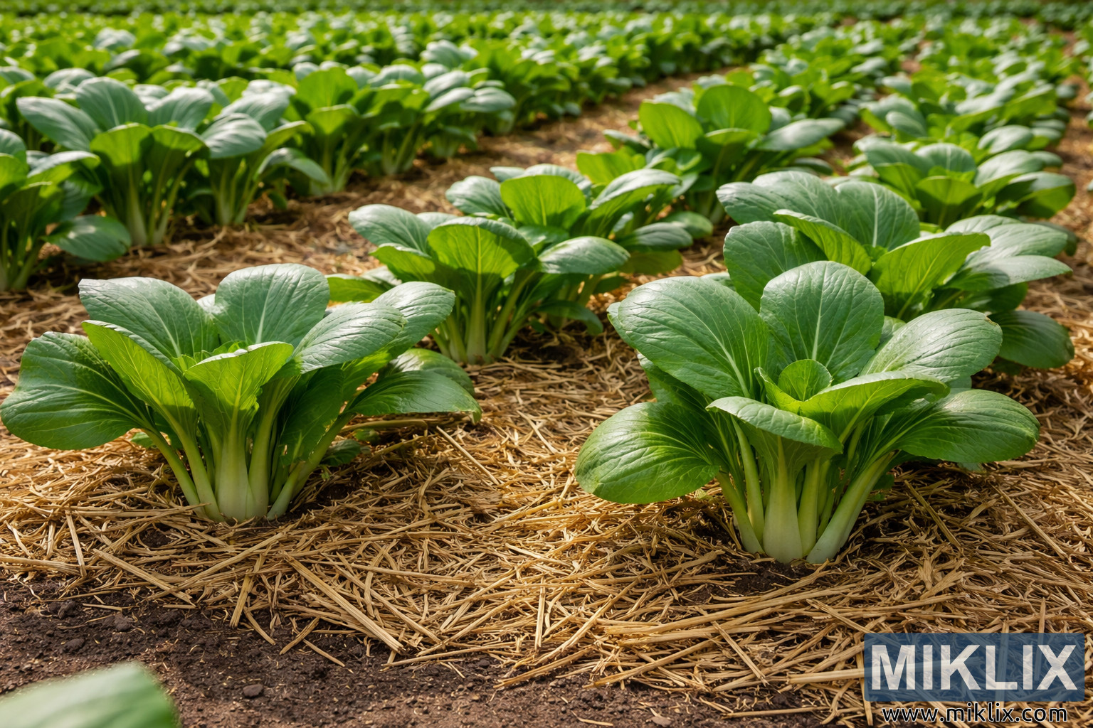 Mulched Bok Choy Beds in a Thriving Vegetable Garden
